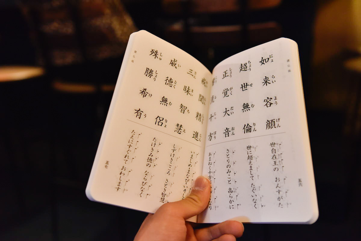 また藤岡さんをはじめお坊さんと一緒に、お経を読むこともできる。まずは藤岡さんが一節を唱え、その後続けてお客さんが一緒に唱えるという流れで行われた。