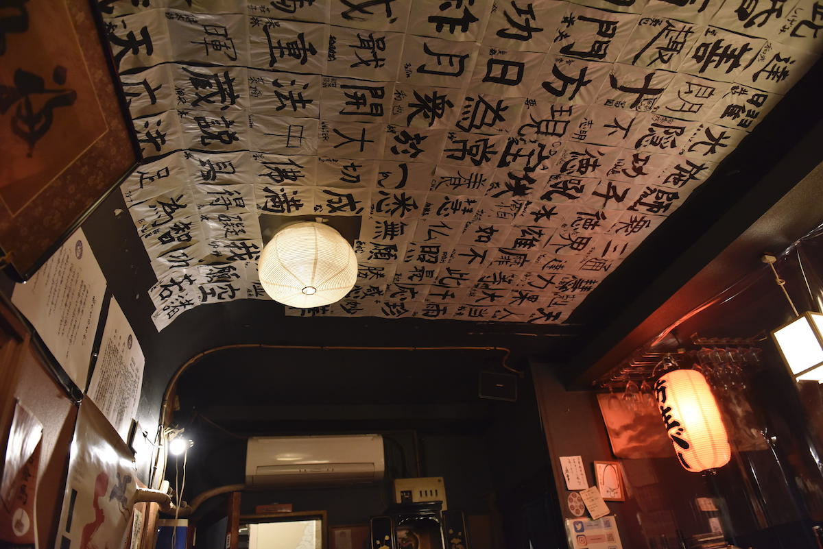 お客さんが書いた習字の作品を天井に貼り付けているそうだ