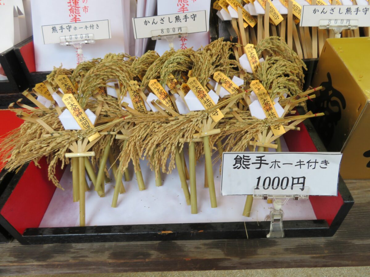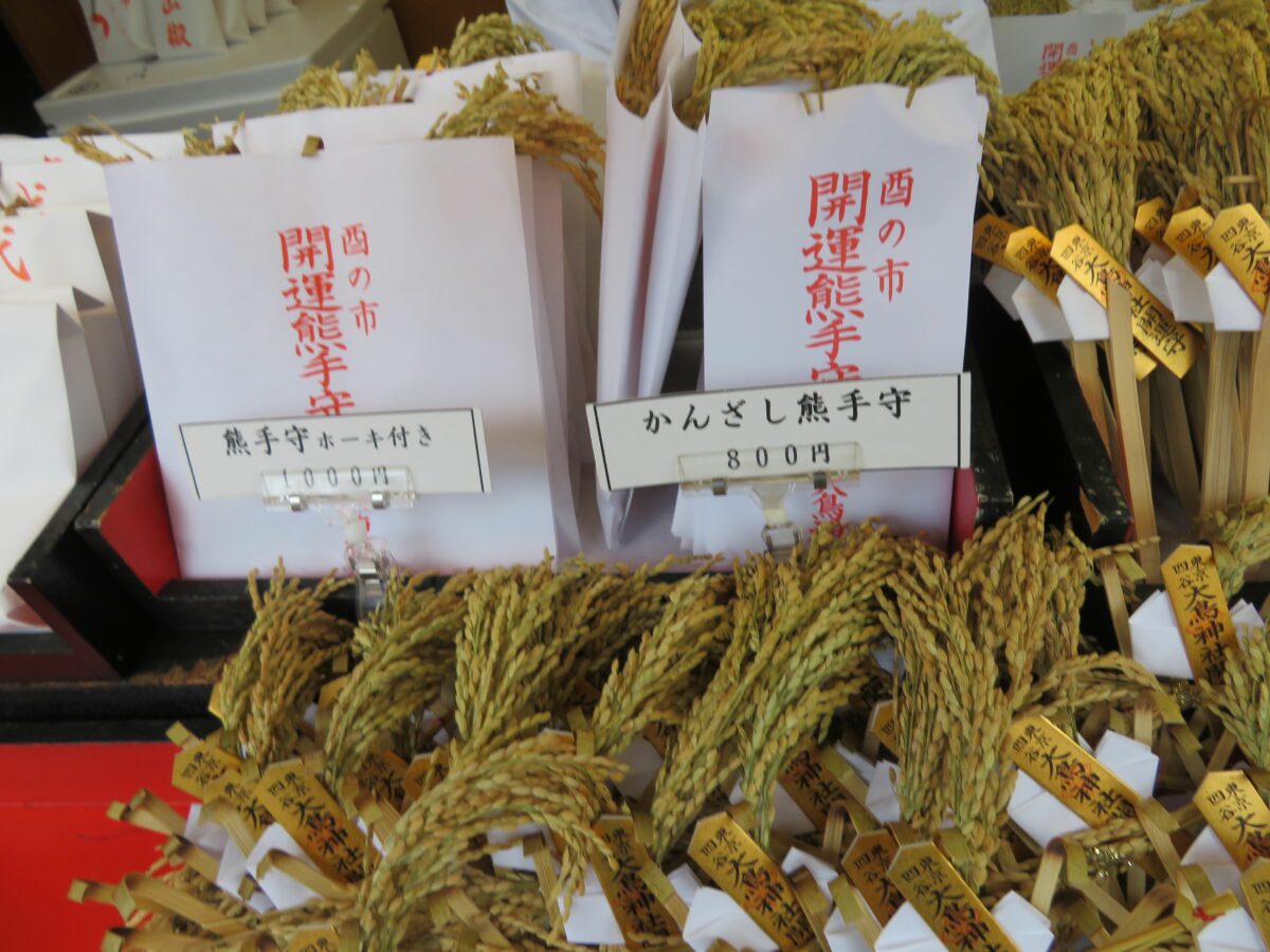 酉の日には社殿に隣接する授与所で、ホーキ付きの熊手や開運熊手守が授与されます。熊手守には古くから、熊手で福をかっこむご利益が期待されています。開運熊手守の授与を受けた参拝者は、豪華景品が当たる開運宝くじを引くことができます。また、酉の市の名物「切山椒」は、山椒の香りで厄を払う和菓子です。