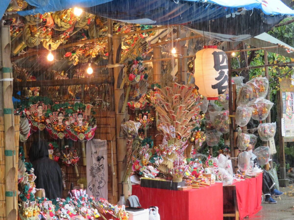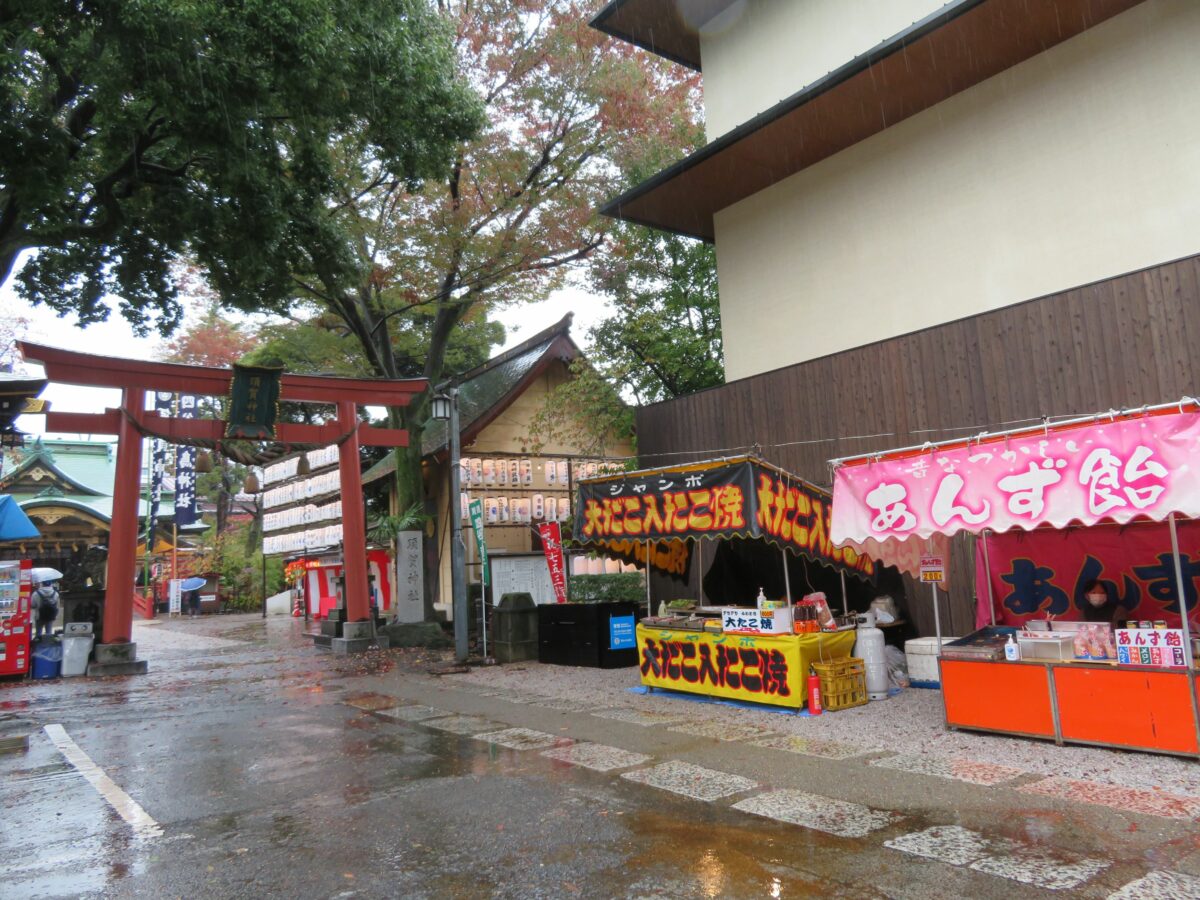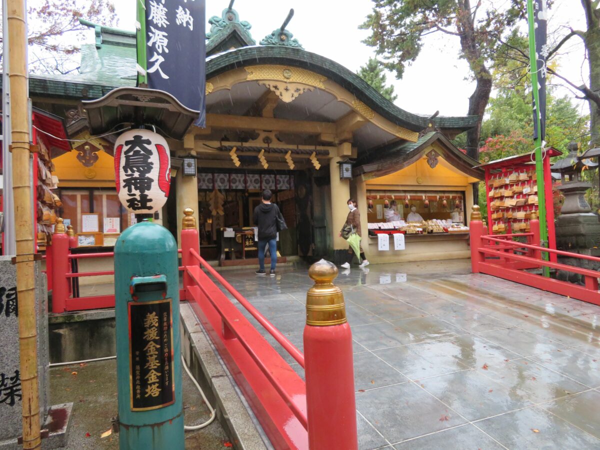 社殿の前には酉の市が立ちます。境内は広くはないので市は数軒程度ですが、商売繁盛が期待できる熊手などが、ぎっしりと詰まっています。大鳥居の前には露店も並びますが、2021年の一の酉の日は日中の天候が優れなかったため、訪れる人はまばらでした。