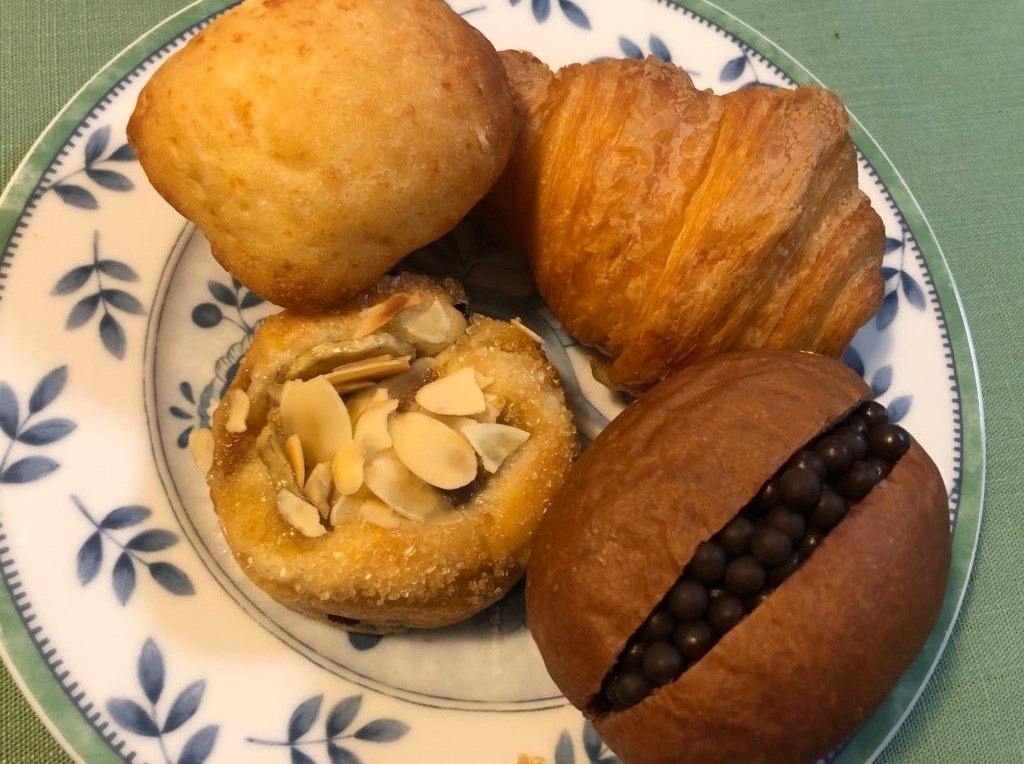 クロッカンショコラは粒粒の食感がとても楽しい。いよかんバナナは異なる二つの味がマッチして高級なおやつのような感じ。どれも小さめに作られていて、このエリアに住む子供連れの三人家族の朝食をイメージして作られているとか。(参考:「365日の考えるパン」杉窪章匡)