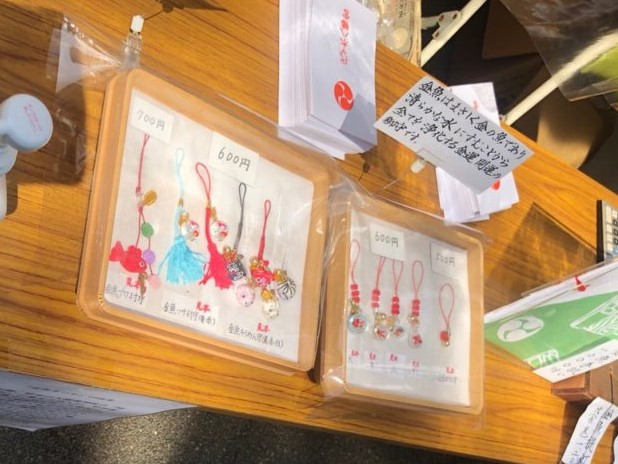 値段は500円前後とお手頃。ガラスに金魚が入っているものや、布製のものなどどれもかわいらしく、ご利益がありそう。布製のものを色違いで家族全員分買っていくお父さんなどもいてほほえましい様子です。