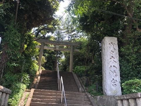 八幡宮の鳥居の前につくと、親子連れが多数階段を上っていきます。整然とした境内では、あじさいが初夏を彩っていました。歩いていくと本殿の横に、かわいい金魚みこしが飾られています。