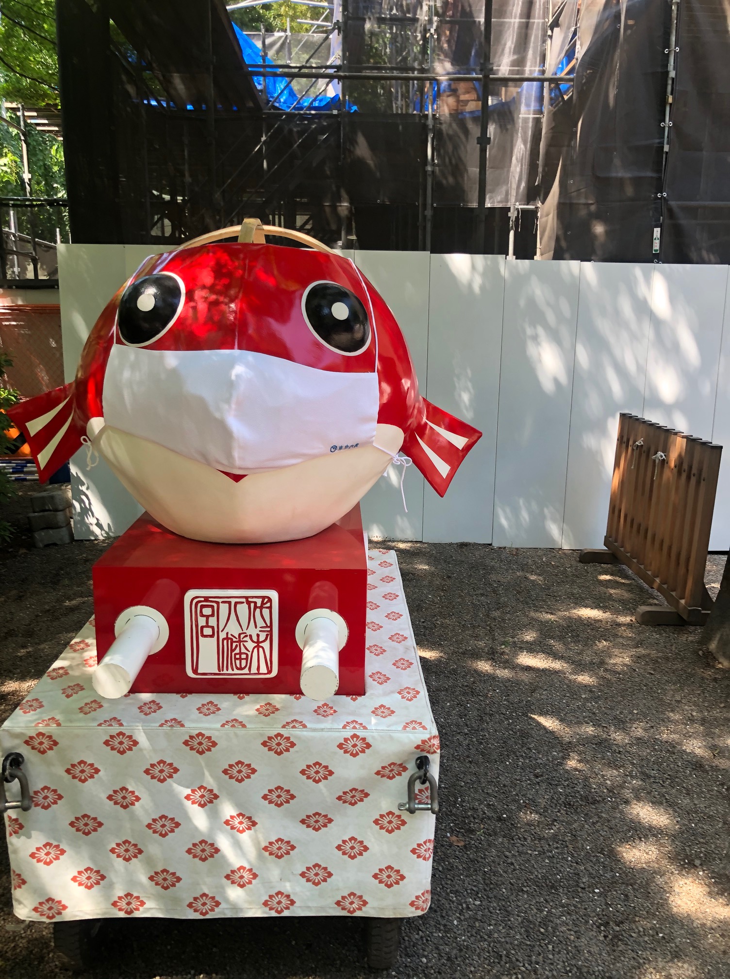 今年は大きなマスクをしていて、金魚もコロナ予防に余念のない様子。密をさけるため、おみこしは展示だけですが、たくさんの親子連れが金魚と一緒に自撮りで写真を撮っていました。
