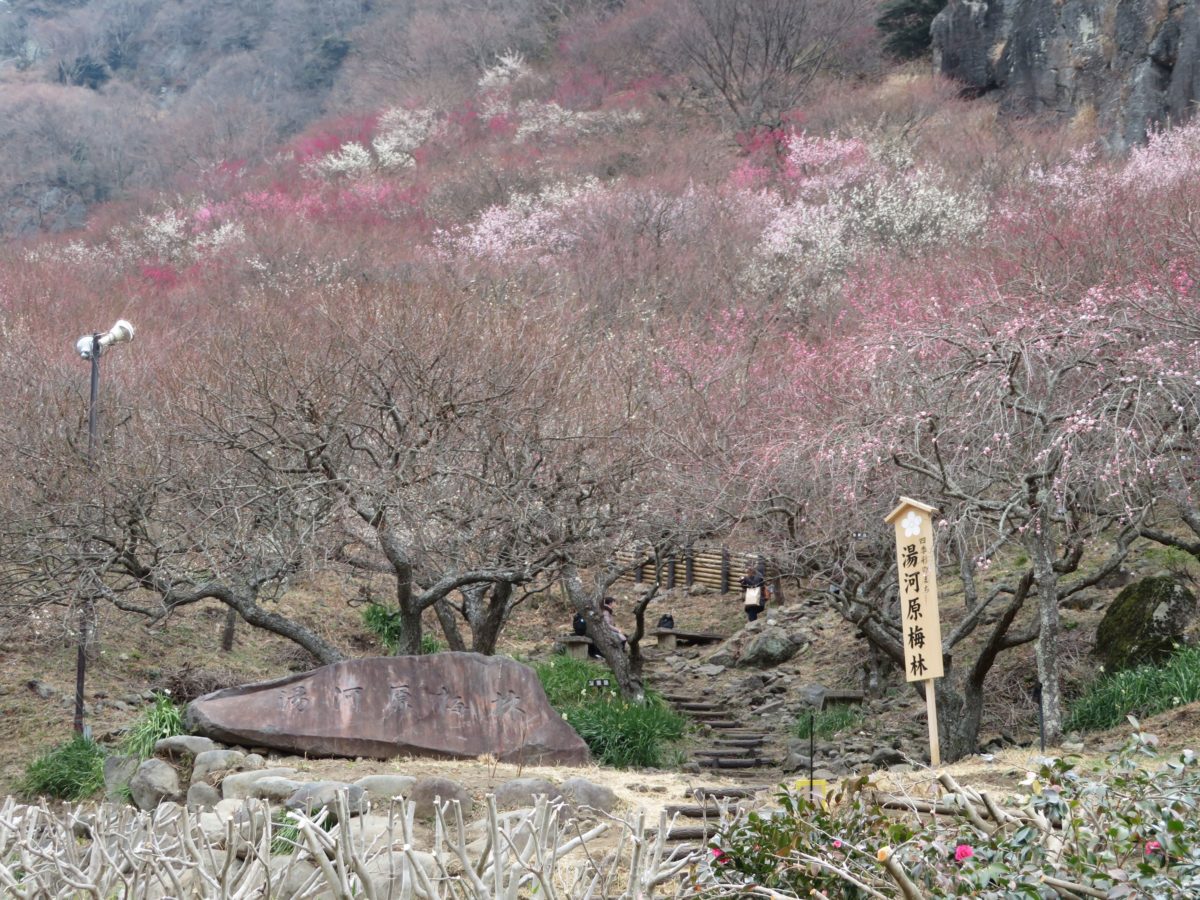 横浜からだと在来線で約1時間の湯河原は首都圏から気軽に行ける温泉地です。情緒溢れる温泉街は町の西部に広がっていますが、北部には標高約625メートルの幕山が聳えています。南側の山麓には約4,000本の梅が植樹され、例年2月上旬から3月中旬には幕山を季節の彩りで包みます。2021年には2月6日~3月7日の期間で、「湯河原梅林梅の宴」が開催されます。