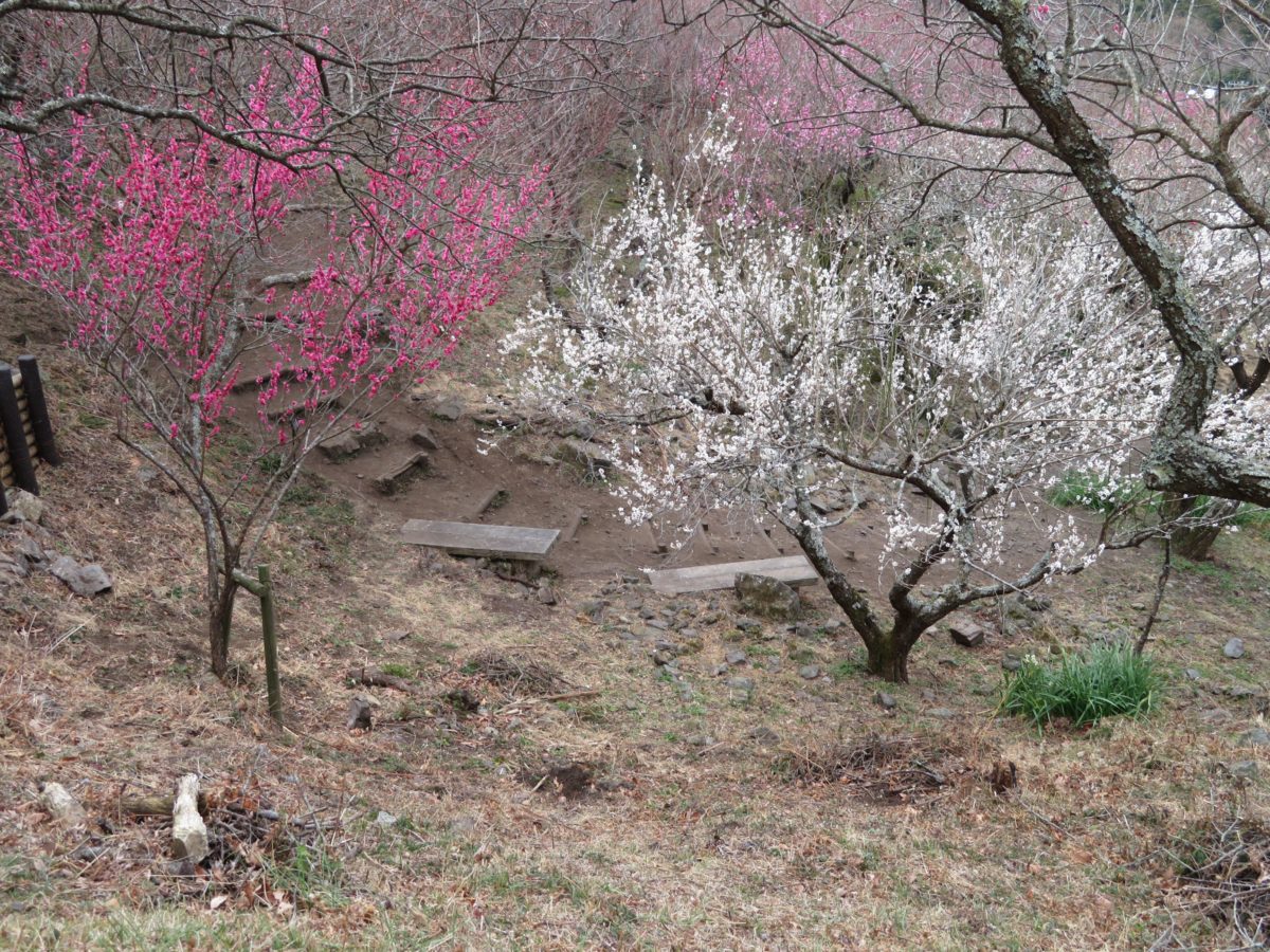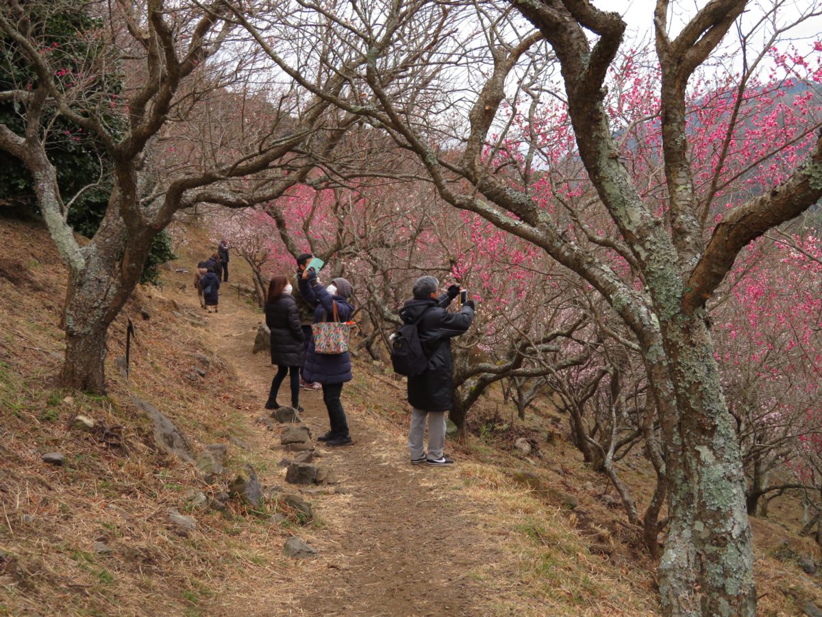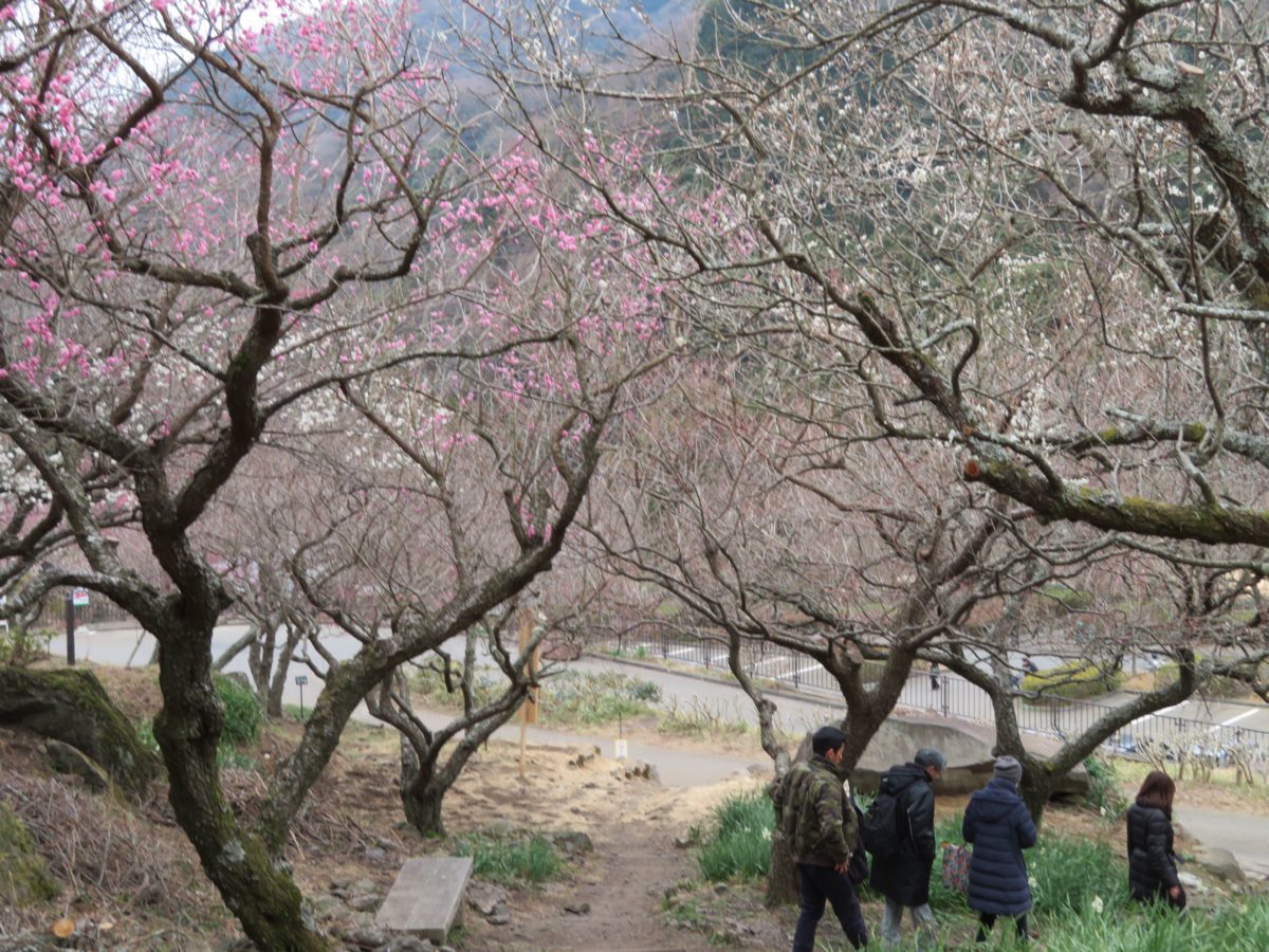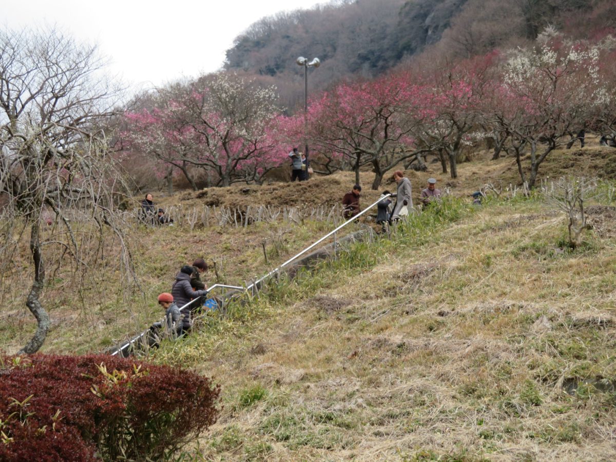 幕山の斜面に整備された遊歩道の上下に咲き乱れる梅の花