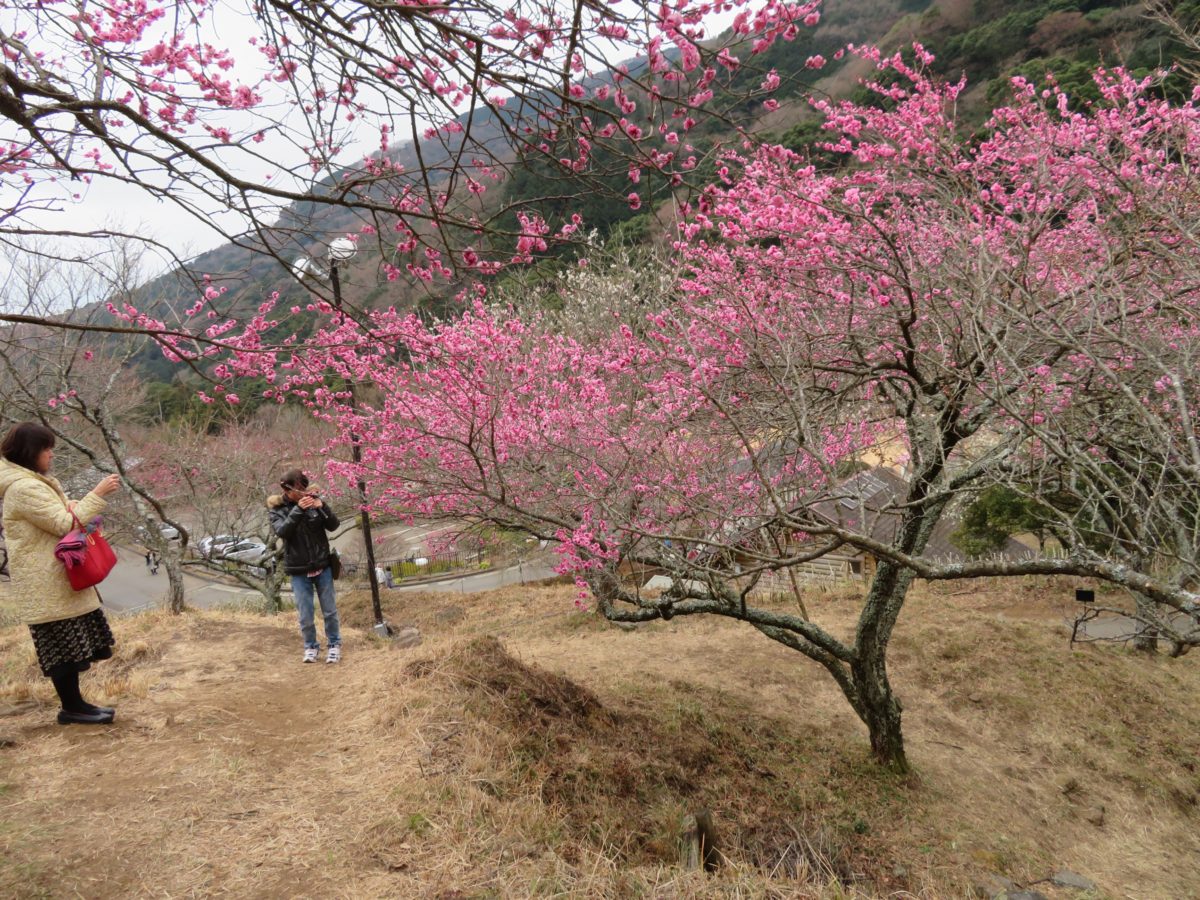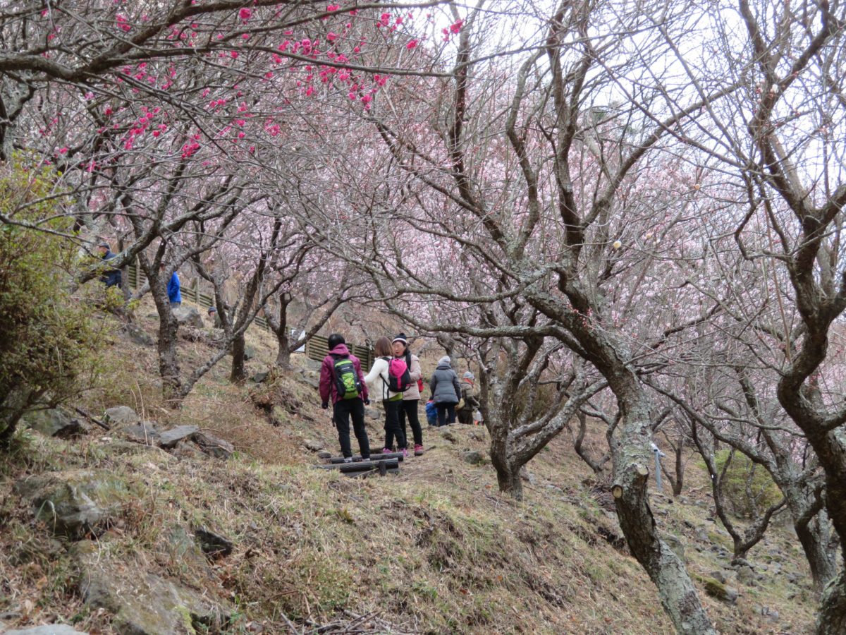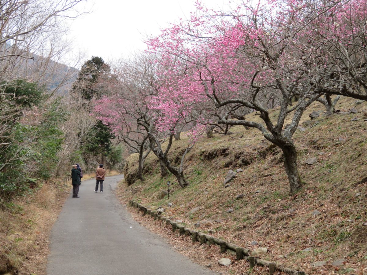 幕山麓に梅が植林されたのは1955年頃からで、地元の人々が崖崩れ防止と将来の観光資源にするためだったのです。1996年には見事な梅林となり、「梅の宴」を開催することができるようになりました。なだらかな山の斜面には、歩きやすい遊歩道が整備されているので、角度を変えながら梅の花を楽しむことができます。梅の色も濃い紅色から薄紅色、白色と種類豊富です。