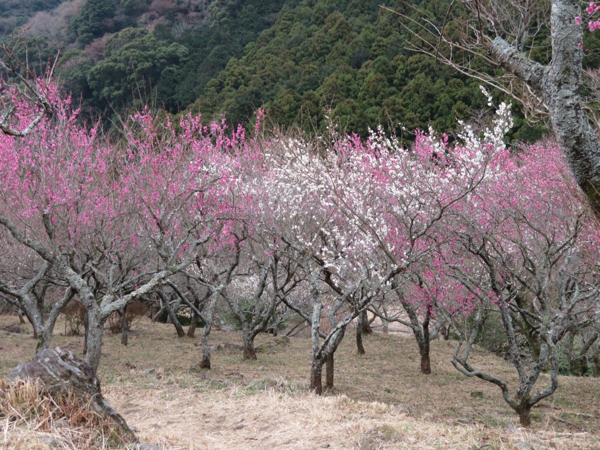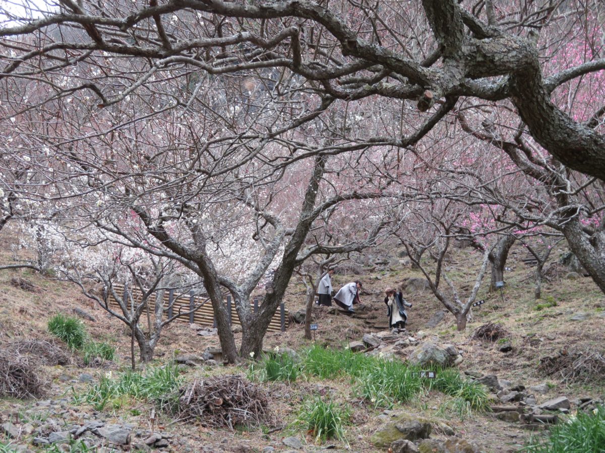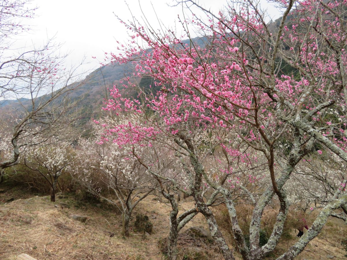 幕山麓に梅が植林されたのは1955年頃からで、地元の人々が崖崩れ防止と将来の観光資源にするためだったのです。1996年には見事な梅林となり、「梅の宴」を開催することができるようになりました。なだらかな山の斜面には、歩きやすい遊歩道が整備されているので、角度を変えながら梅の花を楽しむことができます。梅の色も濃い紅色から薄紅色、白色と種類豊富です。