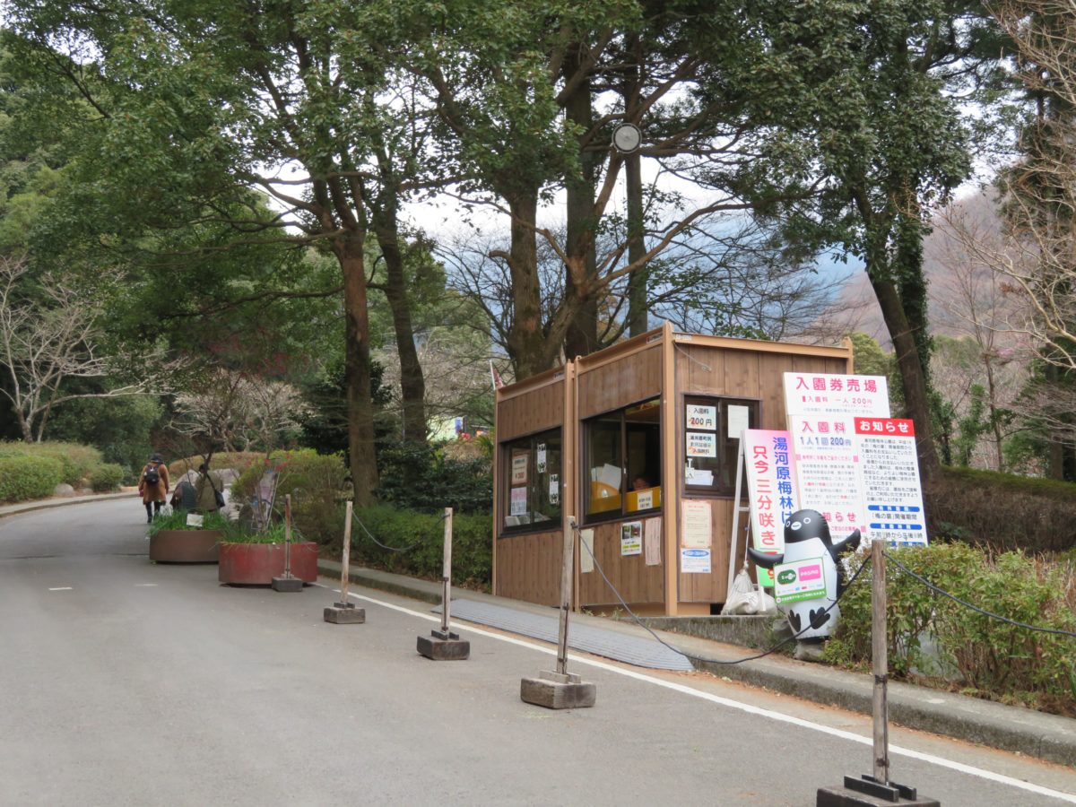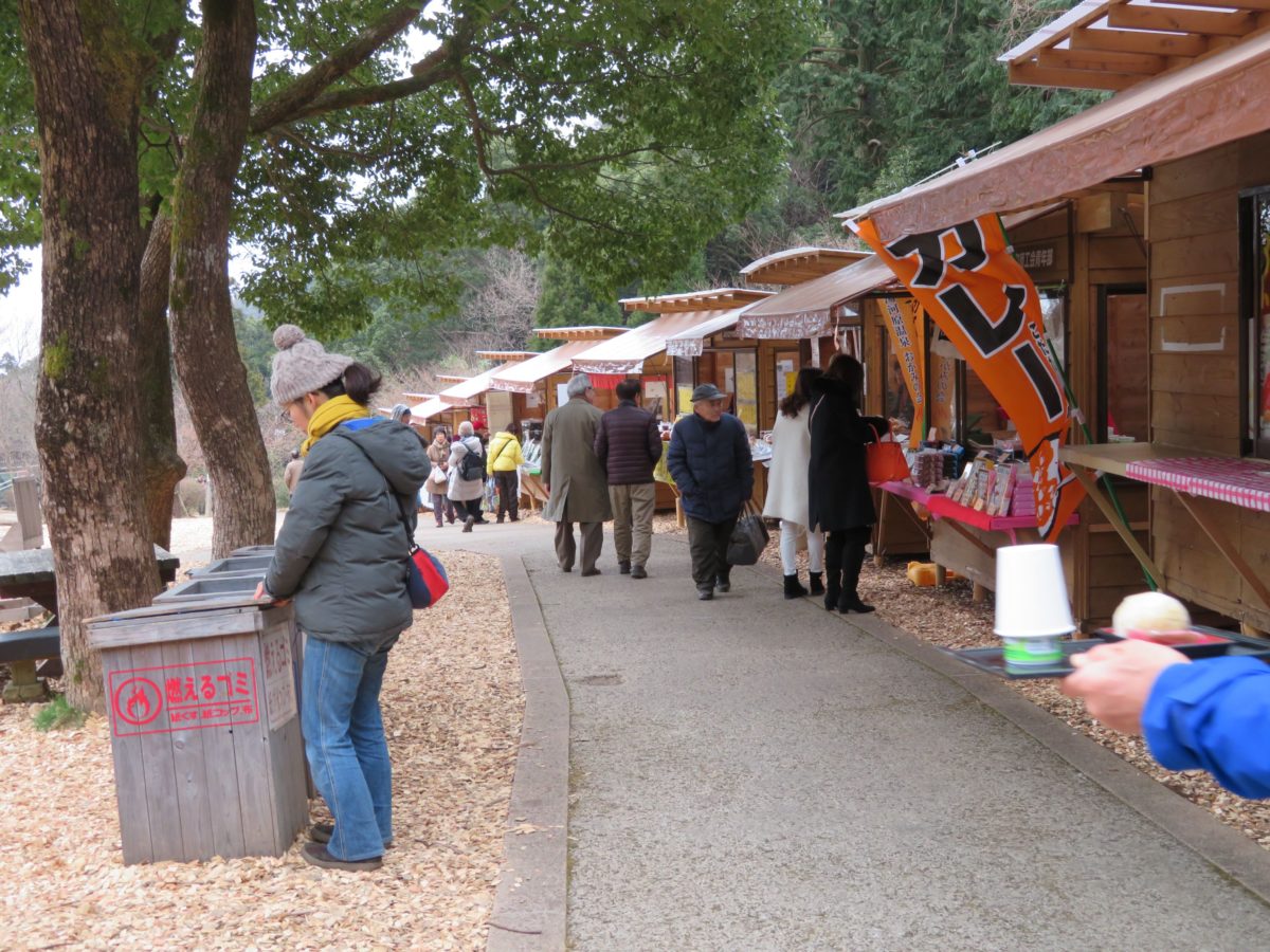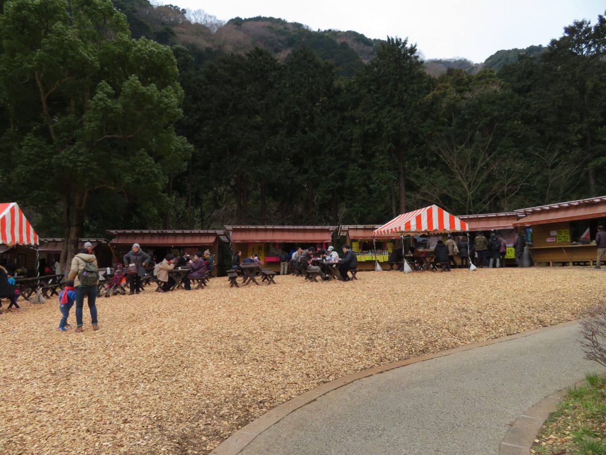 公園内には常設の売店の他に、「梅の宴」の期間中には入口付近の広場に露店が軒を連ねます。露店には、梅ソフトクリーム、酒むしまんじゅうの他、各種の軽食が揃い、相模湾の海の幸の販売も行っています。また入口の横には足湯が設けられているので、坂道を歩いた足の疲れを癒すことができます。