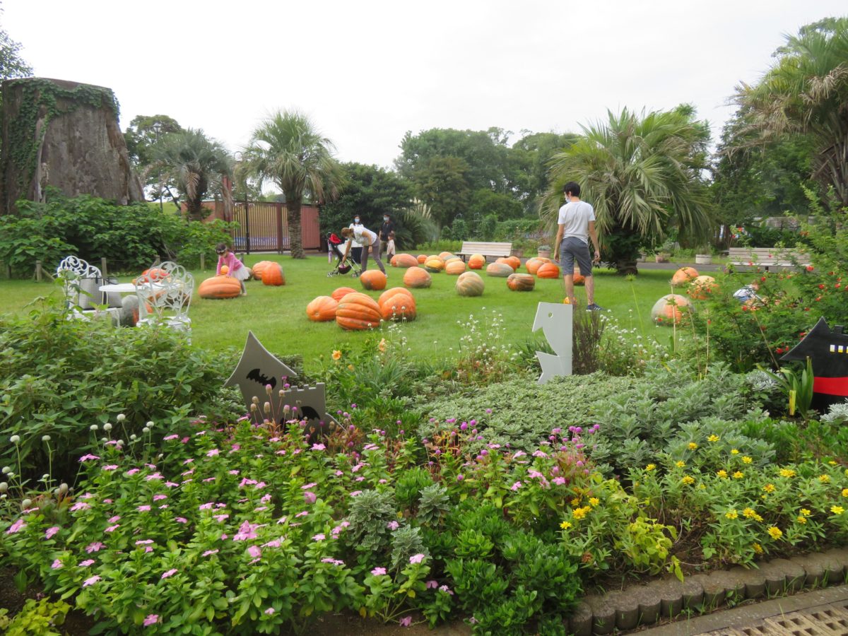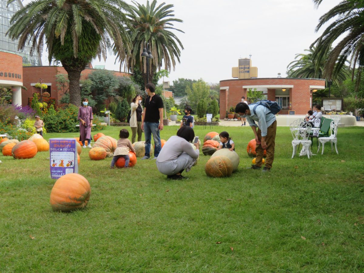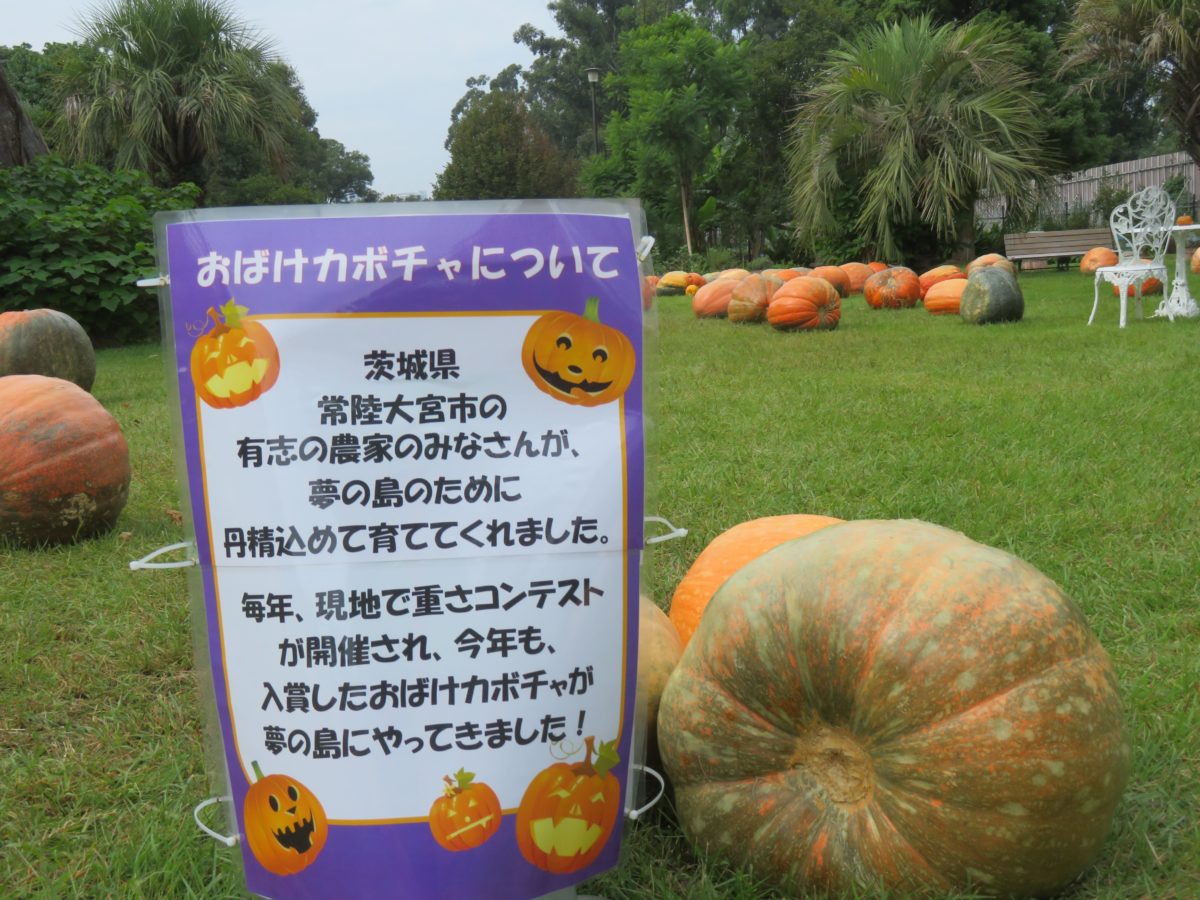 東京都江東区の夢の島熱帯植物館では例年10月を中心に「ハロウィン・パーティー」が開催されています。茨城県常陸大宮市から運ばれてきた、おばけカボチャが芝生広場に転がり現代アートのようです。