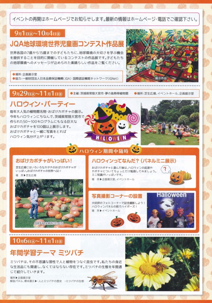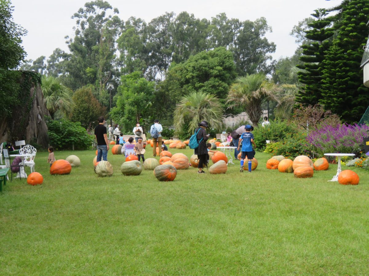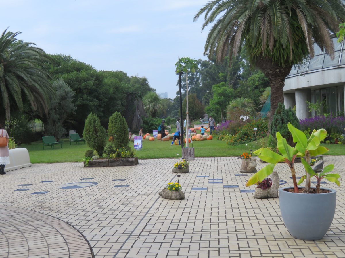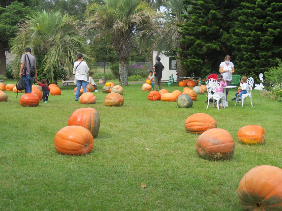 東京都江東区の夢の島熱帯植物館では例年10月を中心に「ハロウィン・パーティー」が開催されています。茨城県常陸大宮市から運ばれてきた、おばけカボチャが芝生広場に転がり現代アートのようです。