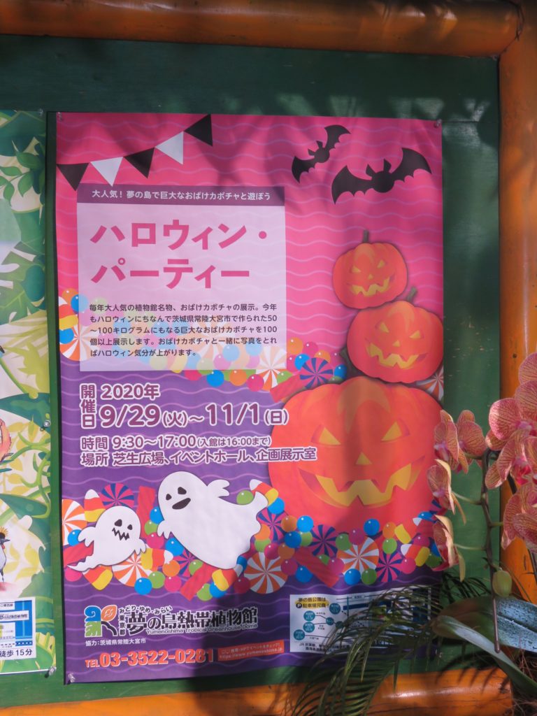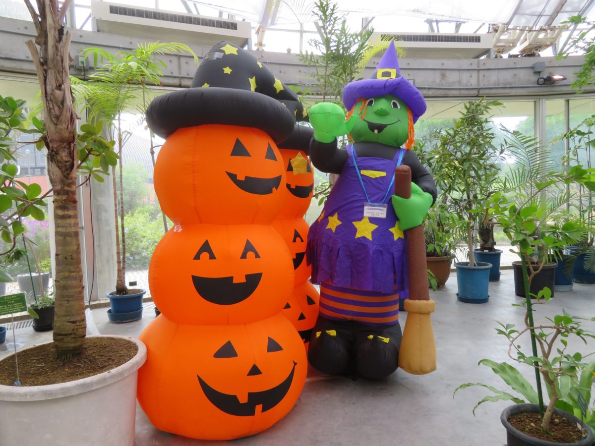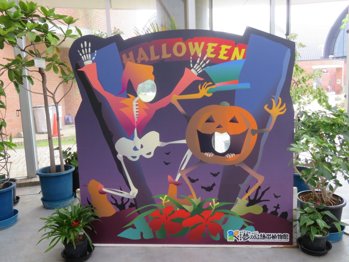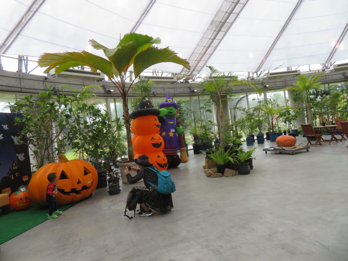 館内にはドリンクや軽食が楽しめる喫茶室も設けられ、トロピカルなフルーツジュースや、ナシゴレンなどのアジア料理を味わうことができます。喫茶室の入口には「ジャック・オー・ランタン」が飾られ、売店でもハロウィン・グッズが販売されています。