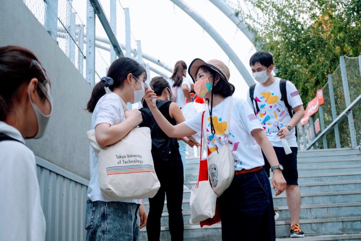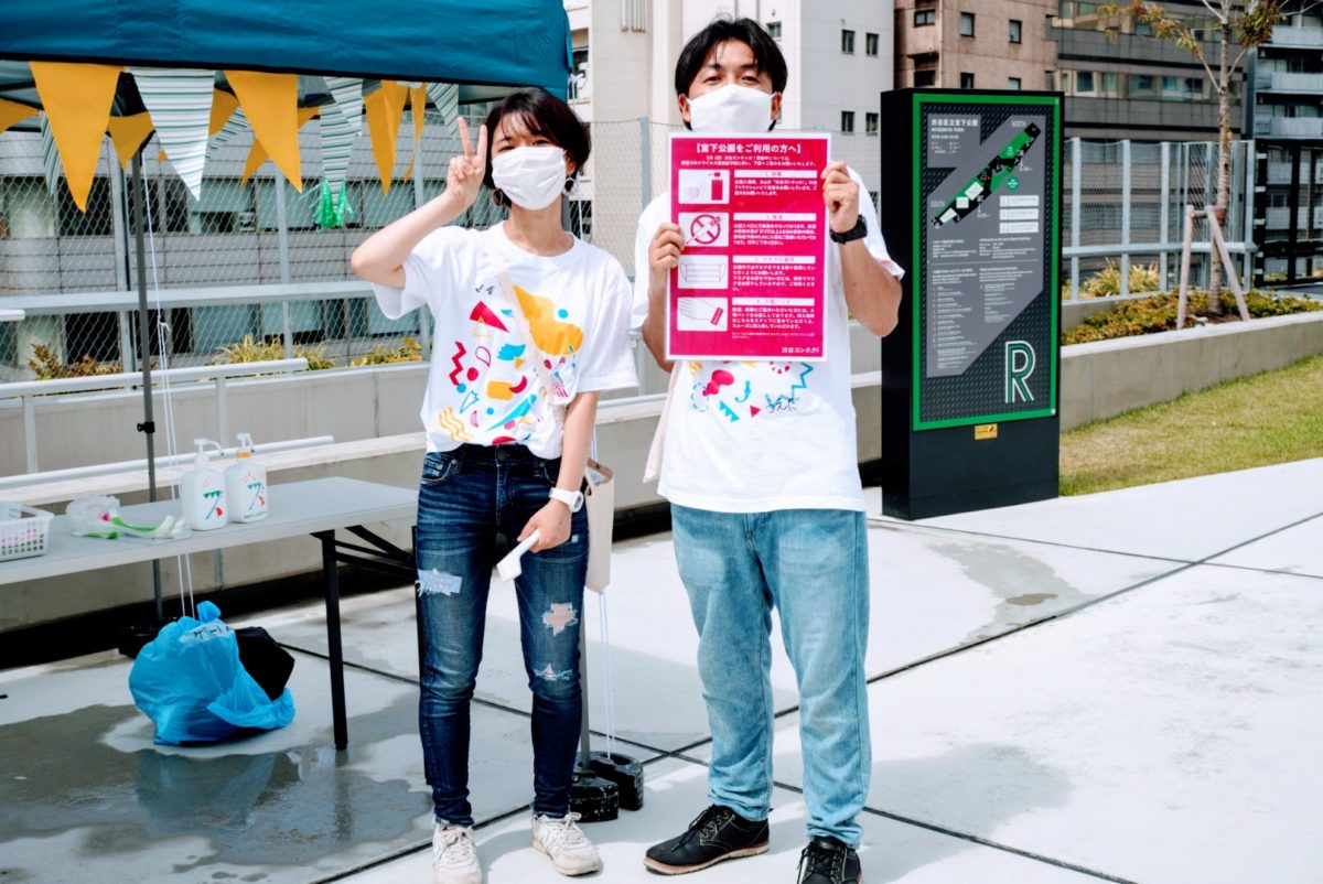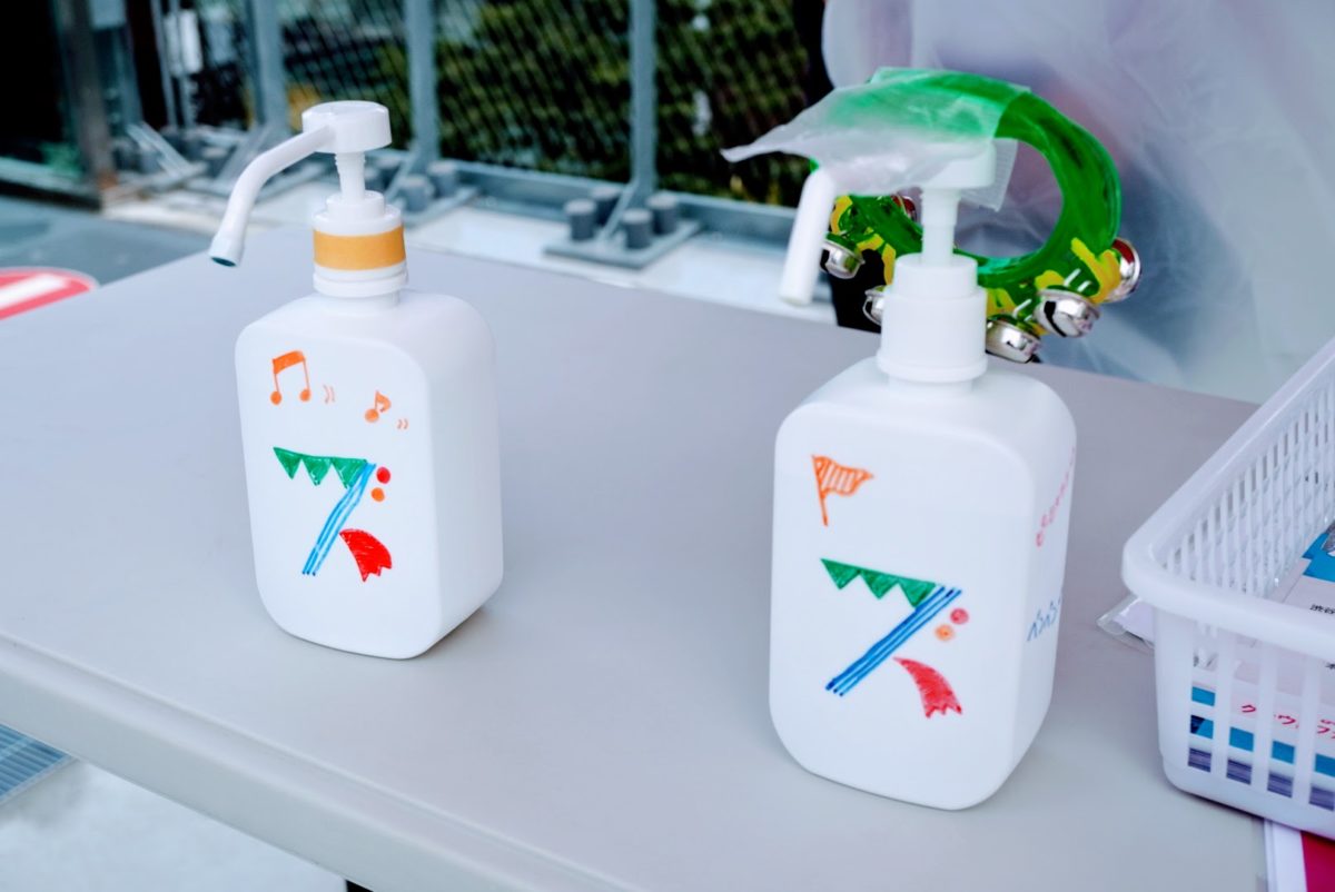 さらに、来場者の方にもメイン会場となった屋上の宮下公園につながるすべての入口で検温と消毒にご協力いただきました。それでいて、アルコール消毒用のボトルもどこか楽しげ。