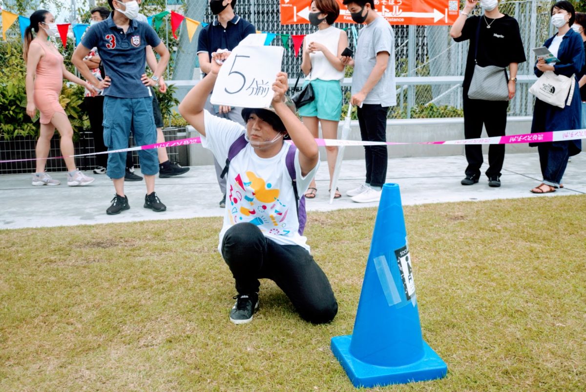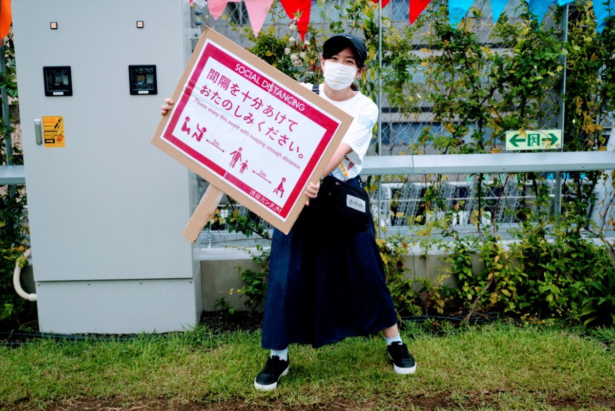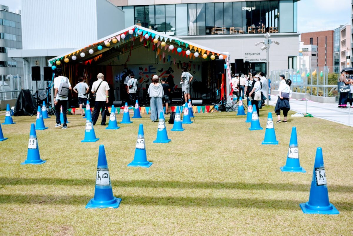 大会場となった芝生ひろばの観客席には等間隔に三角コーンを設置してソーシャル・ディスタンスに配慮。小規模の会場には人数制限を設け、また混んできた際には「両手を広げて他人にふれない距離(2メートル)を空けてください」との注意喚起がくり返し行われました。