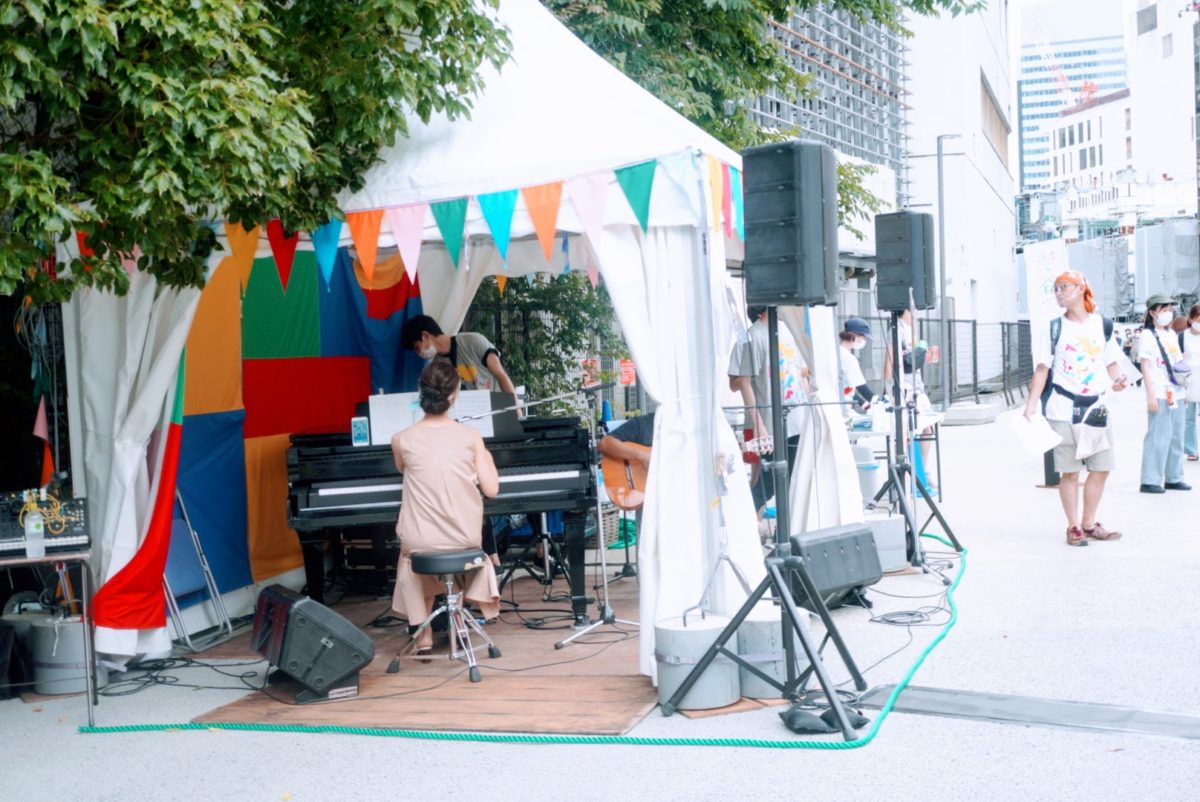 「始」(はじまり)のエリアでは、大型複合施設「ミヤシタパーク」の入り口にグランド・ピアノを設置。渋谷らしい、ストリート・ライブを演奏。