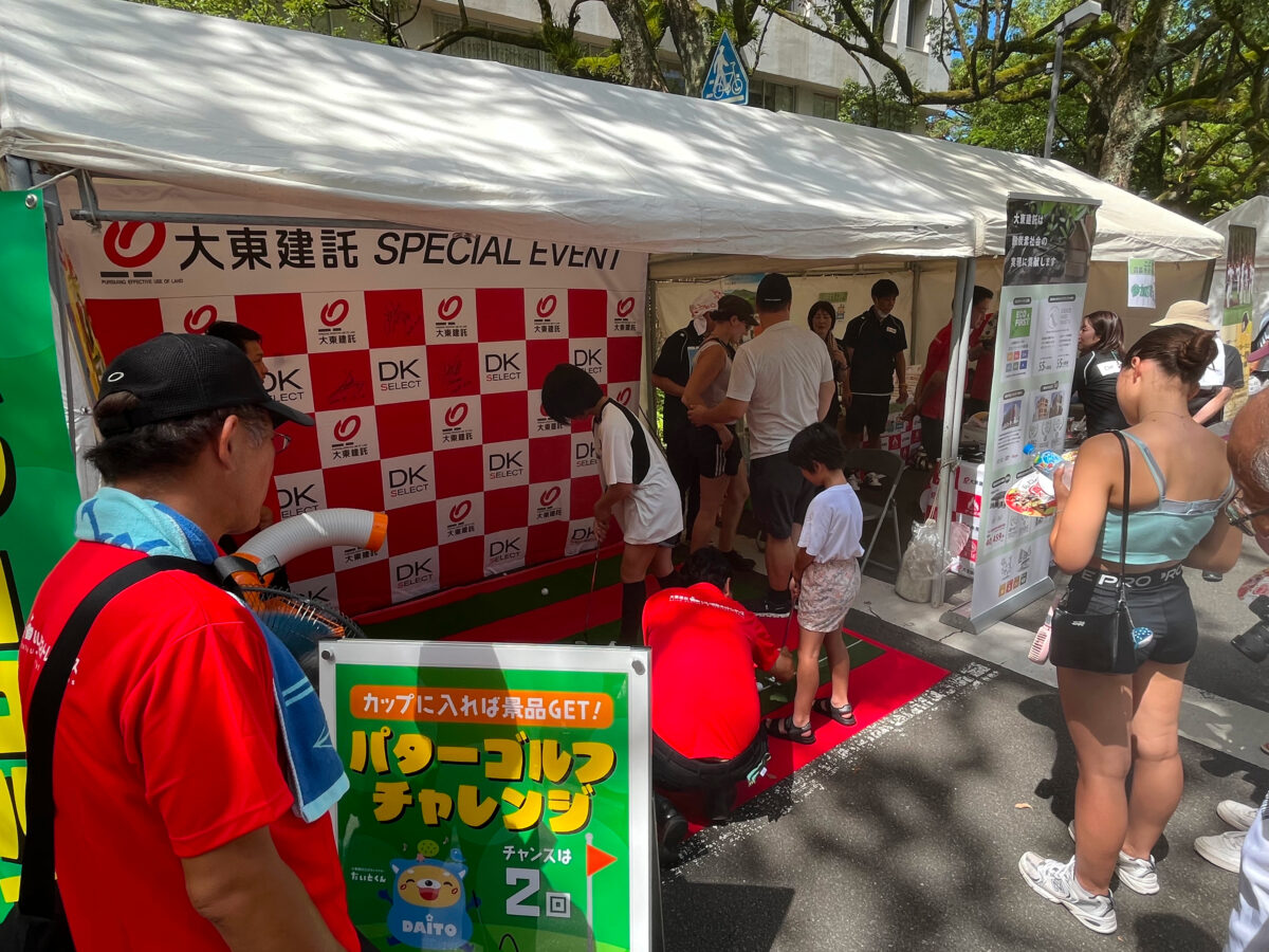 協賛先の選定に当たっては、各事業所からの意見も取り入れ、大きく三つの取り組みを行うこととしました。一つ目は支店の社員が地域の方々と直接触れ合える「ブース出展」です。「旭川冬まつり」では、ボールで的を射抜くストラックアウト、「まつりえれこっちゃみやざき」では、大人も子どもも楽しめる「パターゴルフ」を展開しました。どちらも大勢のお客様に楽しんでいただき、大東建託社員と地域のお子様が触れ合う微笑ましい光景が見られました。