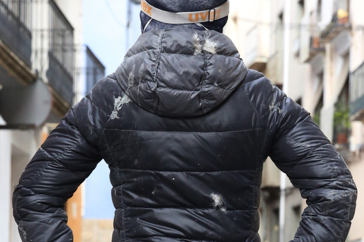 「エルス・エンファリナッツ」取材後の南さん。焦げたダウンジャケットから白い羽毛が露出。