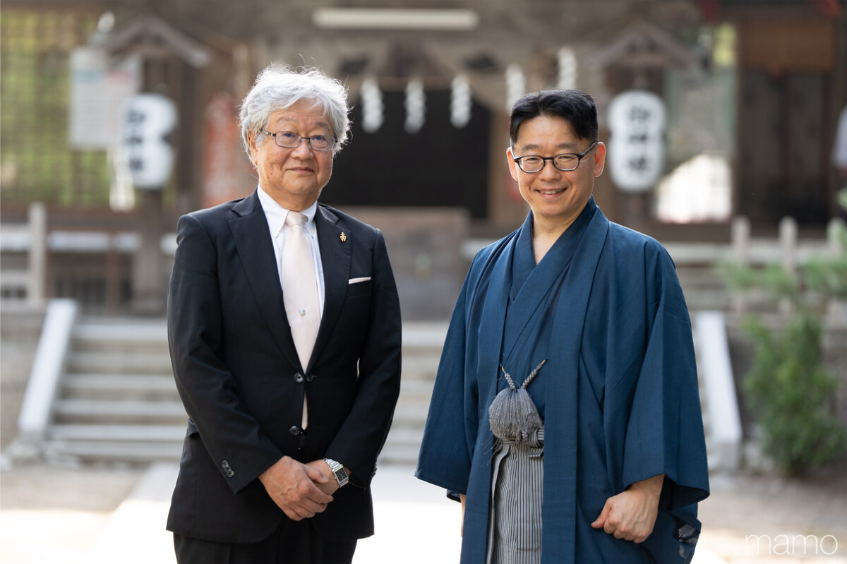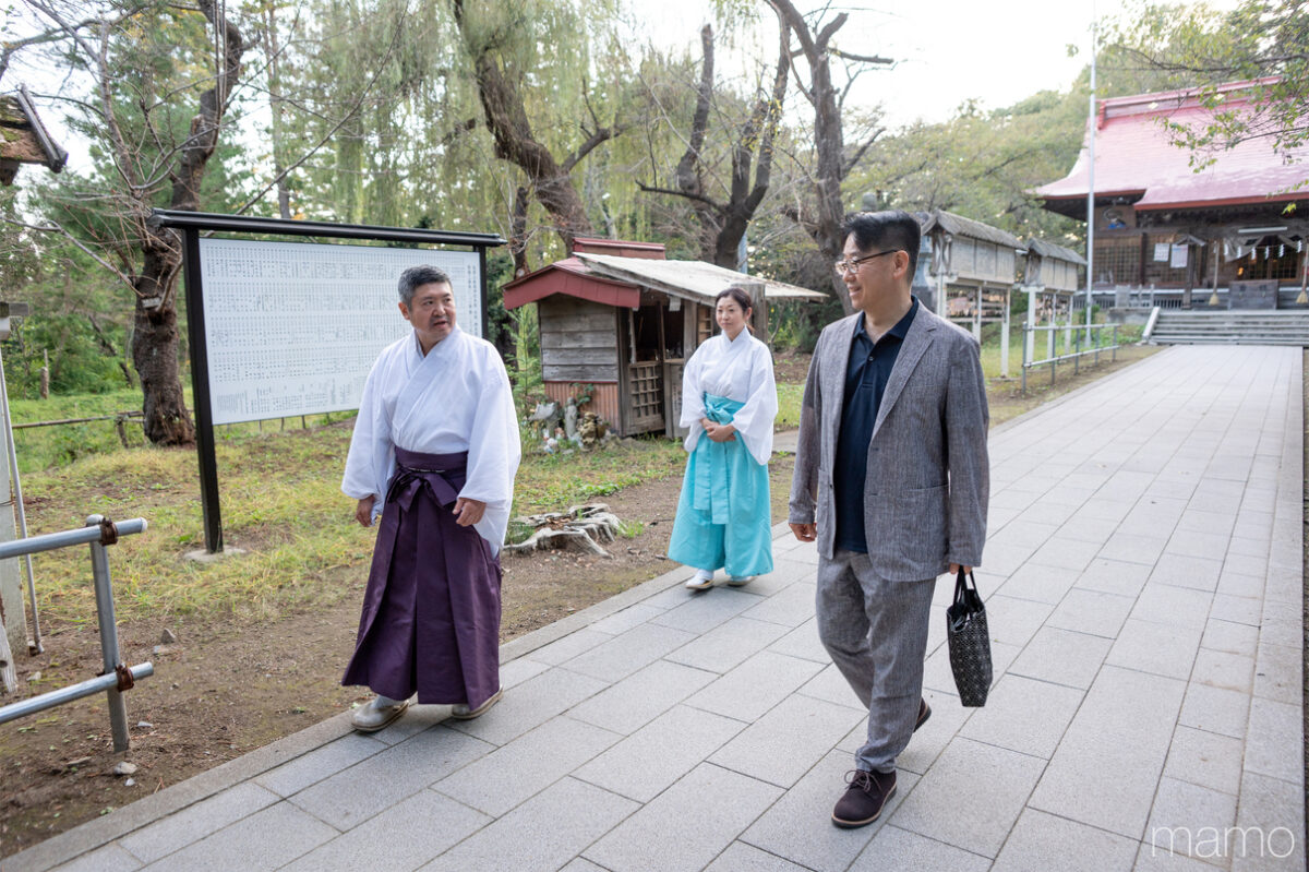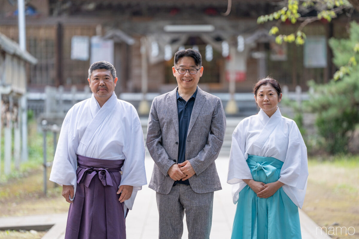 長者山新羅神社に向かうと、禰宜の柳川泰孝さん、権禰宜の直美さんが出迎えてくれました。2月の「八戸えんぶり」、8月の「八戸三社大祭」という、八戸を代表する二つの祭りの中心地の一つとなる、由緒ある神社です。