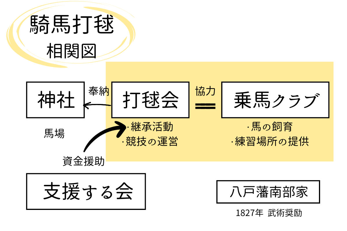 近年は市民有志による支援団体「南部打毬を支援する会」も立ち上がりました。主に騎馬打毬当日の会場での募金活動を行い、打毬会への資金援助に取り組んでいます。支援団体や神社も加えると、4者が騎馬打毬を支えています。