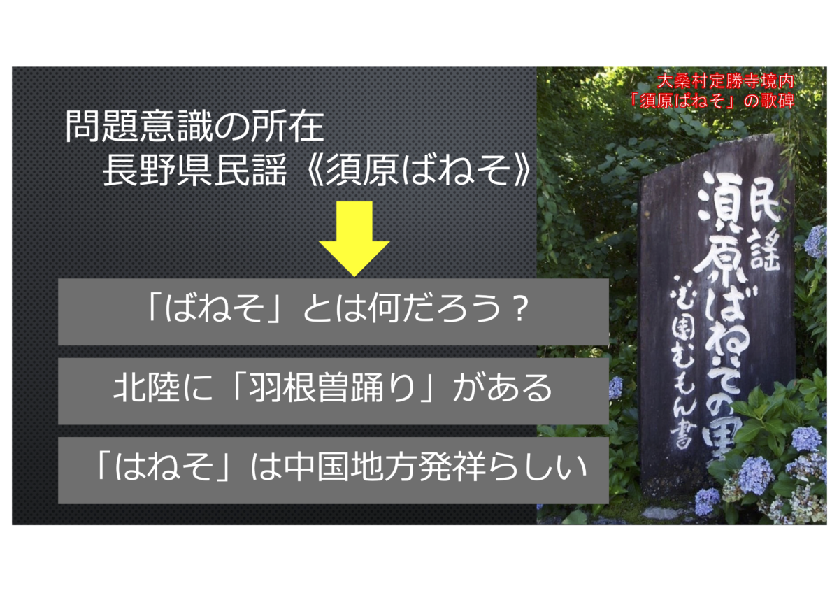 まず、私は長野県の上田市に住んでいます。須原ばねそ保存会の皆様、初めましてよろしくお願いします。私、ばねそ大好きで、本当にいい歌だと思っています。このばねそを知って、まず「ばねそって何だろう」と思ったのがきっかけで調べ始めて、その後、北陸に「はねそ」があることに気づき、さらにはどうやら中国地方が発祥らしいということが分かってきました。こんな背景から、この「はねそ」の謎に迫ってみたいと考えました。今回は、民謡の音楽的視点、メロディ、歌詞、伴奏、踊り、装束といった周辺要素をリサーチしてみたいと思います。