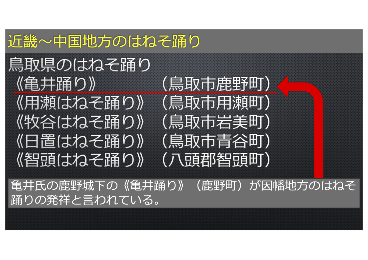 次に、西日本、鳥取県の「はねそ」を調べてみました。鳥取県の伝統芸能アーカイブで「はねそ」を検索すると、鳥取市の鹿野町の踊りが因幡地方の「はねそ踊り」の発祥だと言われています。鳥取県の「はねそ踊り」は、七七の口説きで、ストーリー性のあるものを語り、テンポは中程度です。伴奏は太鼓のみ、または無伴奏のものもあります。踊りは鳥追いの笠をかぶって優雅に踊るものですが、亀井踊りだけは紋付き黒装束で踊られているそうです。丹土はねそ踊は、先ほど岡田会長からお話しいただいたように、詩の中身はストーリー性のある口説で、テンポはやや早めですね。伴奏は太鼓のみで、踊りは歌舞伎の場面を演じるもので、非常に豊かな内容の芸能です。