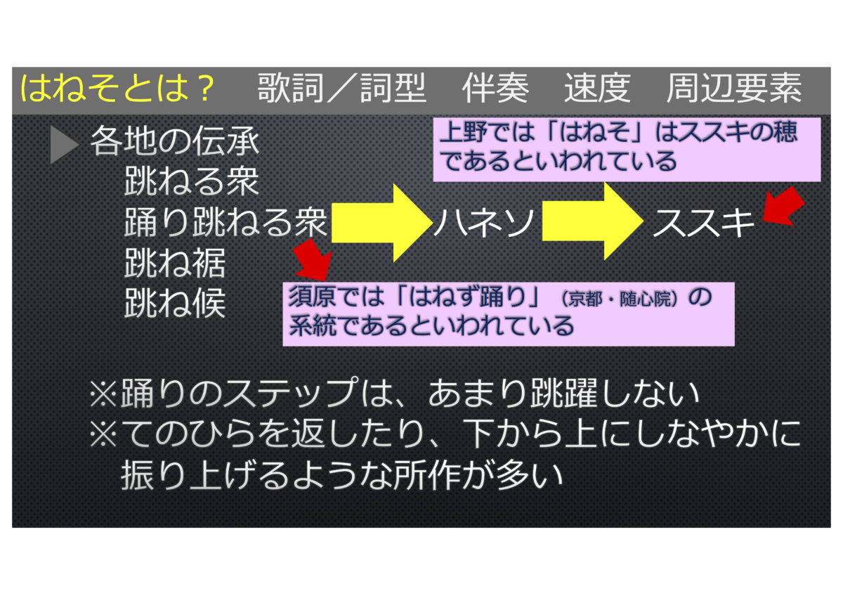 最後にもう一度まとめますと、「はねそ」は中国地方に多いようです。「跳ねる衆」「跳ね裾」「跳ね候」という言葉が「ハネソ」の語源と伝承されていますが、踊りを見るとあまり跳ね踊る感じではないですね。ただ、上野の方では、「ススキの穂」であると伝承されています。確かに、手の動きとかススキが揺れているようにも思えてきます。須原では京都・随心院の「はねず踊り」の系統であると伝承されていますが、はねず踊りの「はねず」は、梅の花の色から来ていると言われているので、踊り跳ねる衆、とするには検証が必要だと思います。
