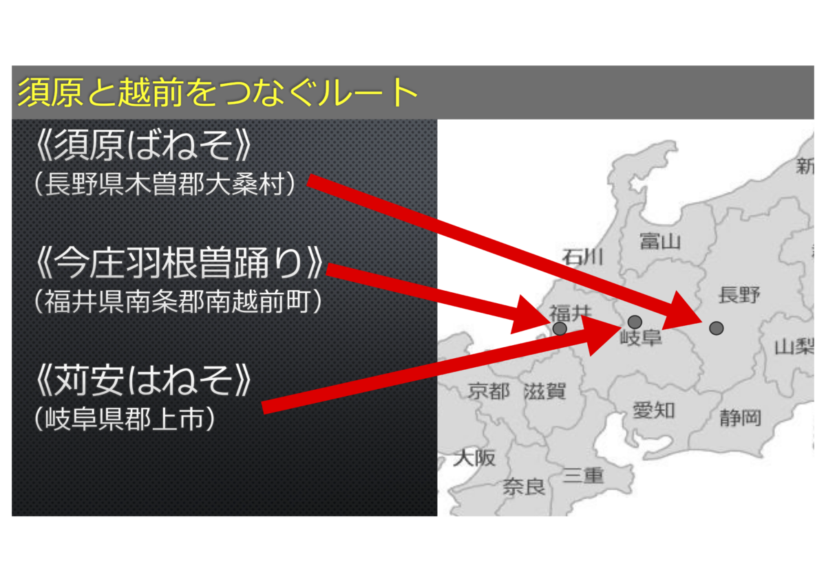 しかし、福井と長野は地理的に離れていますね。そこで、両者をつなぐものはないだろうかと探してみたところ、岐阜県郡上市の苅安というところにも「はねそ」があったんです。歌詞は七七五調の形式で、テンポは中ぐらい、伴奏なしです。踊りは手を打ったり下駄を履いて踊るようなものです。ここでちょっと苅安はねそをみてみましょう。(🎵〜)