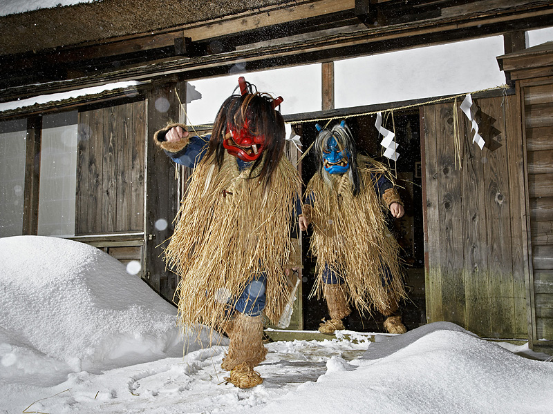 ナマハゲは大晦日の夜に現れ、男鹿半島の各集落の家々を巡ります。ケデ(ワラミノ)を身にまとい、手には包丁やオケを持ち、「泣く子はいねがー!」などと叫ぶ姿はテレビなどを通じて全国的に知られています。神様であるナマハゲは家々で暴れたあと、料理や酒でおもてなしされて去っていきます。
