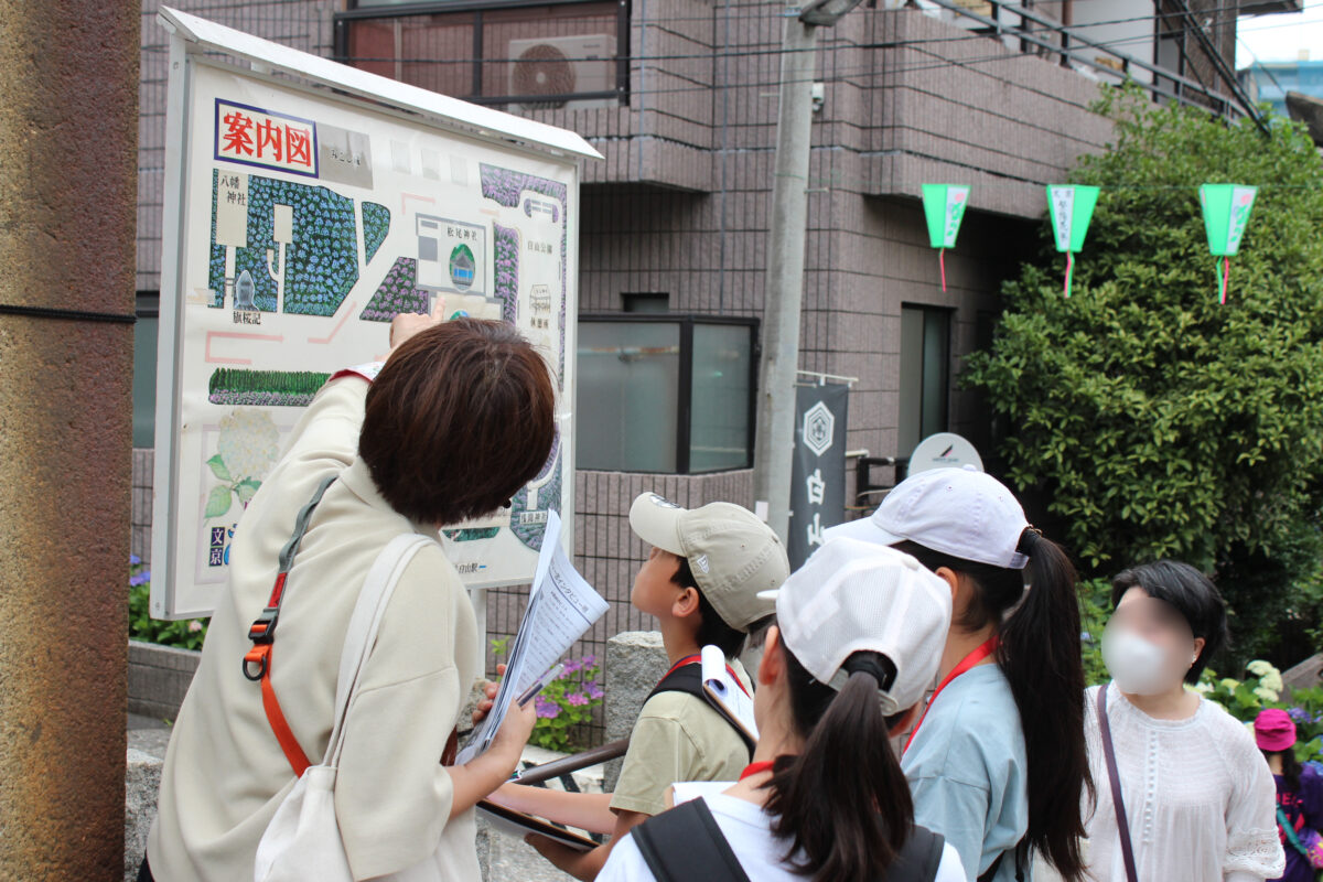 舞台となったのは、白山神社と白山公園で開催された「文京あじさいまつり」。小学4年生から中学生までの15人が参加し、まつりの現場を取材し、 記者体験に挑戦しました。