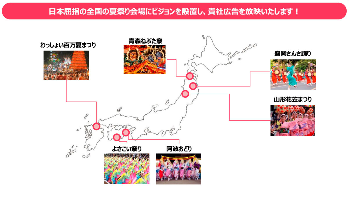 そんな人と熱気が交差する日本有数の祭り会場で、皆様の広告メッセージを届けるオマツリジャパンの広告パッケージが「夏祭りビジョン企画」です。