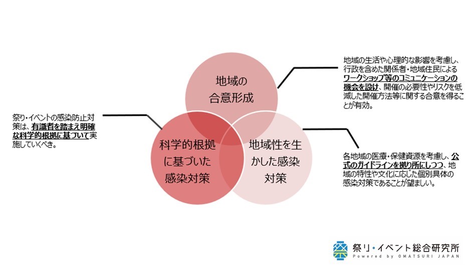 ・新型コロナへの課題感も依然として強いことから他地域での実施事例も参考にする必要があるそのためにも、各地域での祭り・イベント開催に向けた検討では、疫学/祭り・イベント専門家の知見を積極的に地域に取り込み、活用することが必要と思われる。