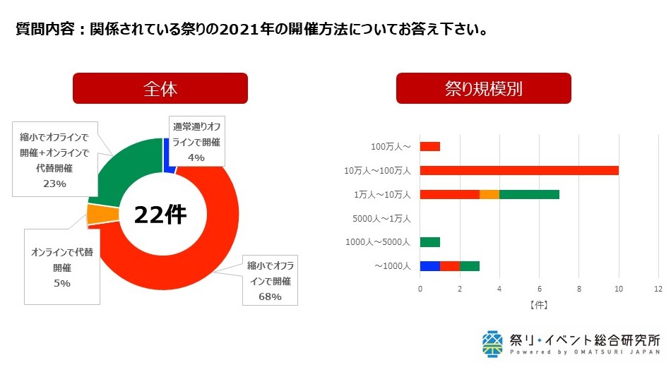 新型コロナウイルス感染症拡大の影響により、規模縮小やオンラインによる代替、あるいはオンラインを掛け合わせて開催するなど、開催された祭りは約半数となり、地域にとって祭りの必要性が明らかになる一方で、関係者が祭りの存続への危機感を募らせていることが浮き彫りとなりました。
