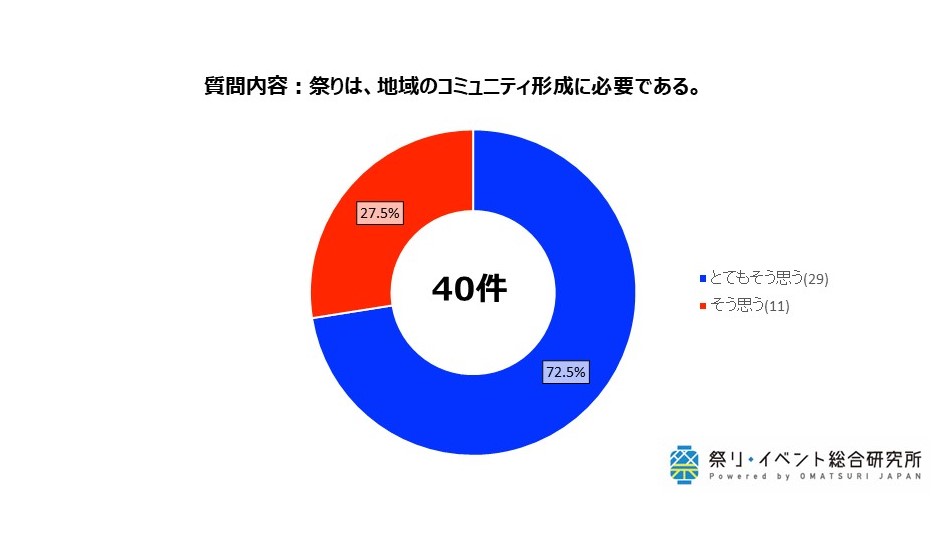 今回の調査では全員が「地域コミュニティ形成に祭りが有効である」と回答していることから、祭り存続への危機感や課題を抱えながらも、地域における祭りの必要性が顕著となりました。
