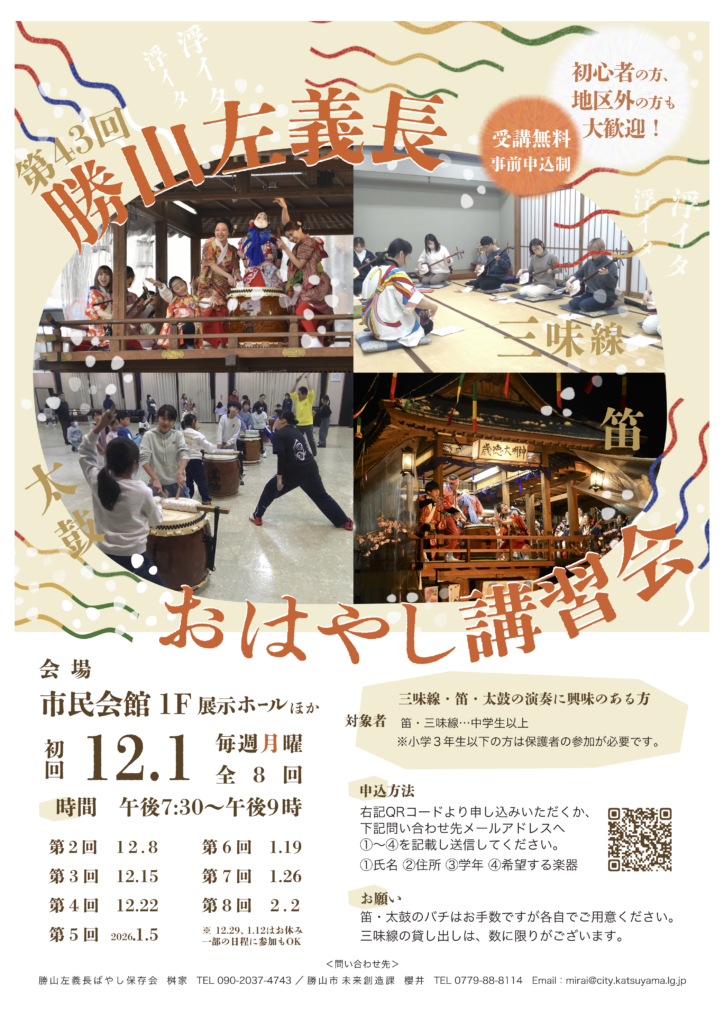 2026年2月に開催される勝山左義長まつりに向けて、「おはやし講習会」を開催します。
