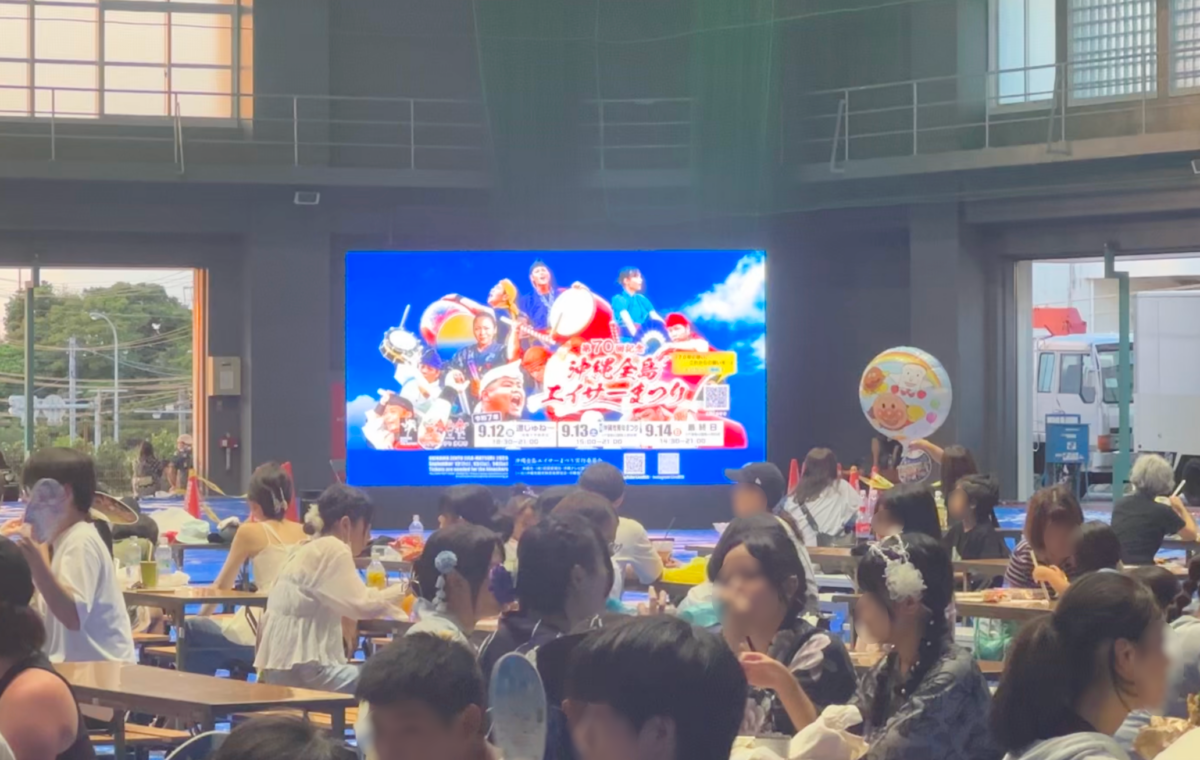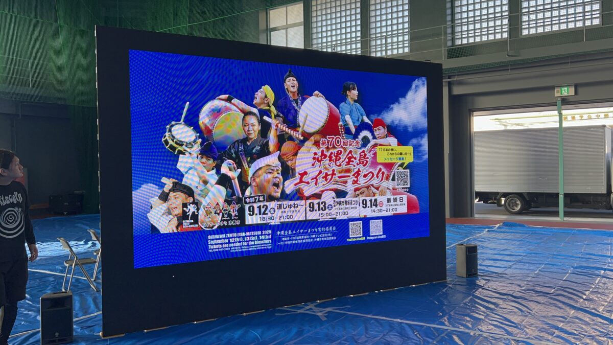 第70回記念沖縄全島エイサーまつりでは、会場の一つであるコザしんきんドーム内に約200インチのLEDビジョンを設置し、協賛映像やPR動画を組み合わせた映像演出を実施しました。