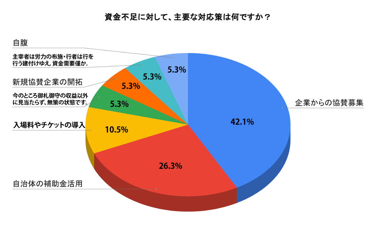 資金不足の対応策:「資金不足」は最大の課題。公的支援だけでなく企業協賛の獲得や入場料の導入を検討。回答者の8割が企業からの協賛に期待。