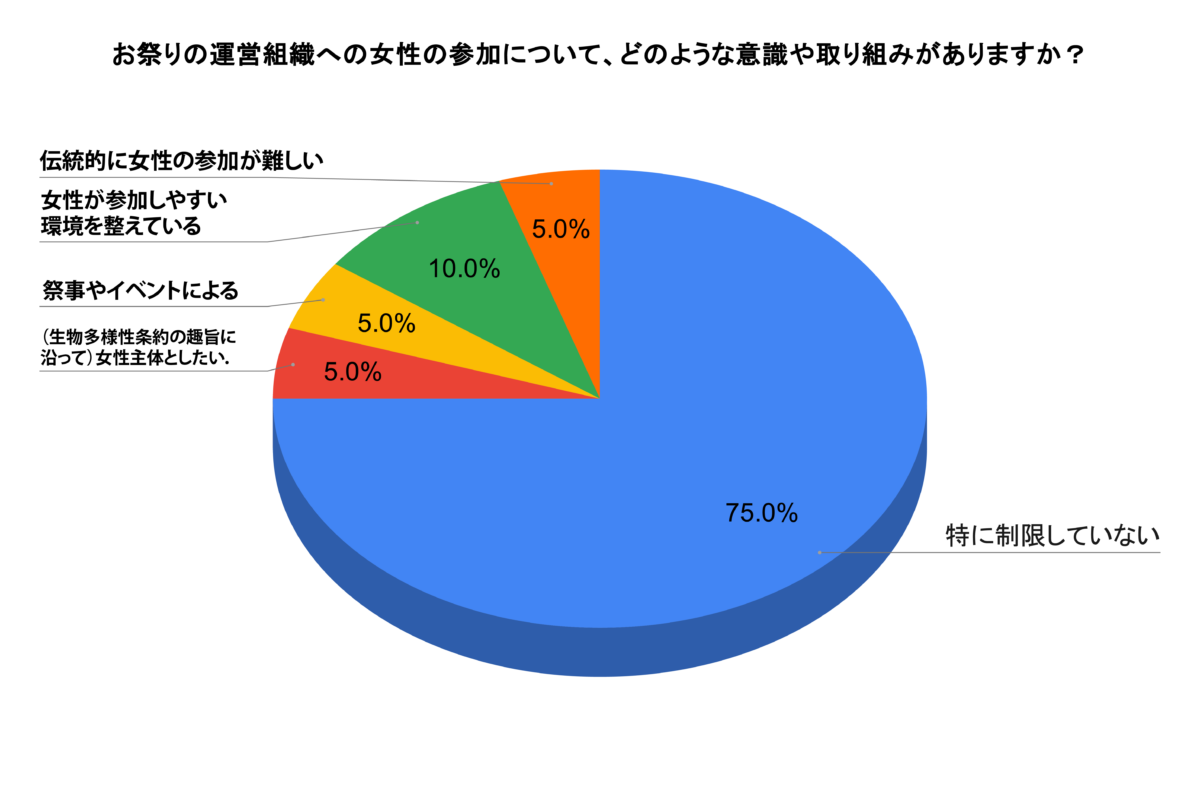 また、こちらもニュースなどで話題になりますが、祭りの運営組織への女性参加については9割の回答者が参加の制限はなく、参加しやすい環境づくりに取り組んでいるという回答でした。一方、伝統的なしきたりを守っていく価値についても重要視するご意見もいただきました。