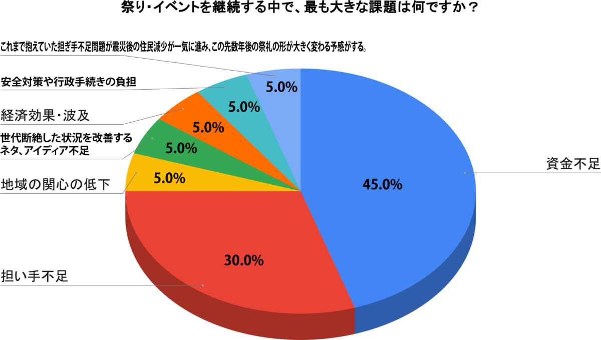 もっとも深刻だったのが「資金不足」。祭りの運営には多額の費用がかかるものの、公的な支援に頼るだけではなく、協賛金の獲得を軸に、入場料の導入など自助の試みが主要な対策になっています。