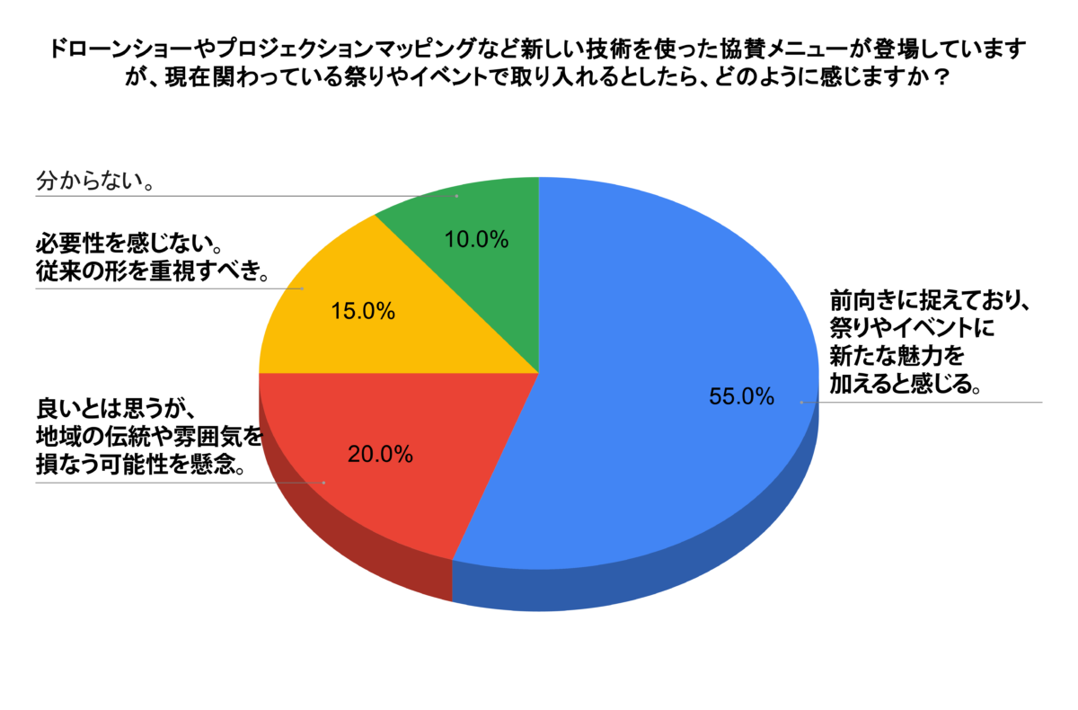 また、ドローンショーやプロジェクションマッピング、LEDビジョンなど、祭り・イベントを盛り上げるために新しい技術を取り入れることに55%の方が前向きな気持ちでいると回答。さらに20%は、「伝統や雰囲気」を損なわない前提で、良いと思うと回答しました。必要ないとの回答は15%でした。
