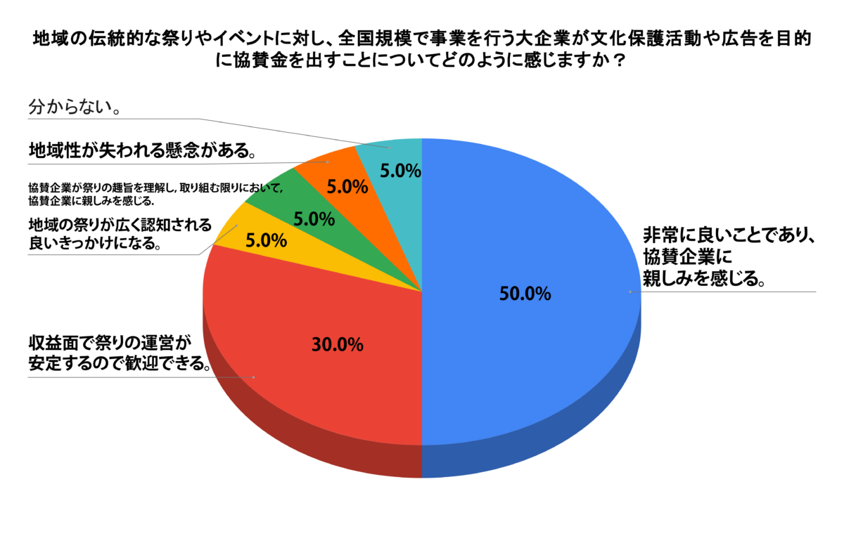 企業協賛では、地域企業からの協賛だけではなく、大企業からの支援・協賛の期待も。8割を超える主催者様が期待する一方で、「地域性を大切に」という願いも垣間見えました。