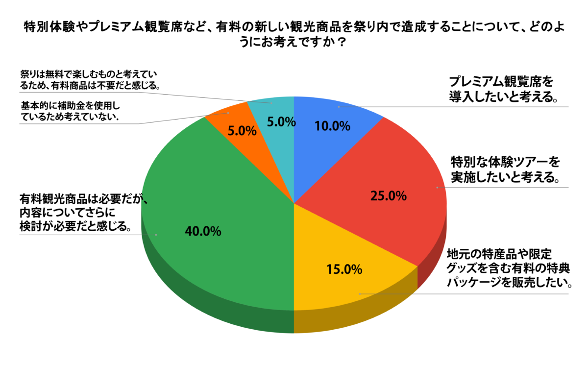 また、「プレミアム観覧席」や「祭りの裏側ツアー」といった有料コンテンツの導入にも関心が高まっています。また、コンテンツ造成を検討しながらも、実施に向けてはさらにアイデアを煮詰めていくことが必要と考えておられるようです。