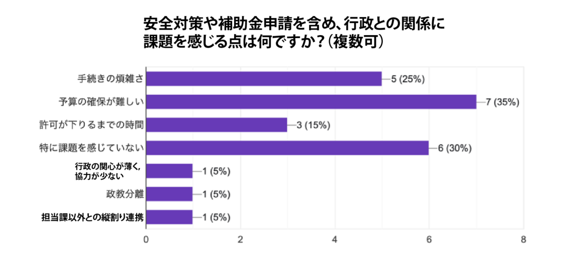 行政との関係については、円満な関係を感じさせる回答もある一方、「補助金申請や安全対策の手続きが煩雑」「予算の確保が難しい」といった声がありました。自由回答では、「行政の関心が薄い」「担当課以外との連携が取れない」というご意見もありました。