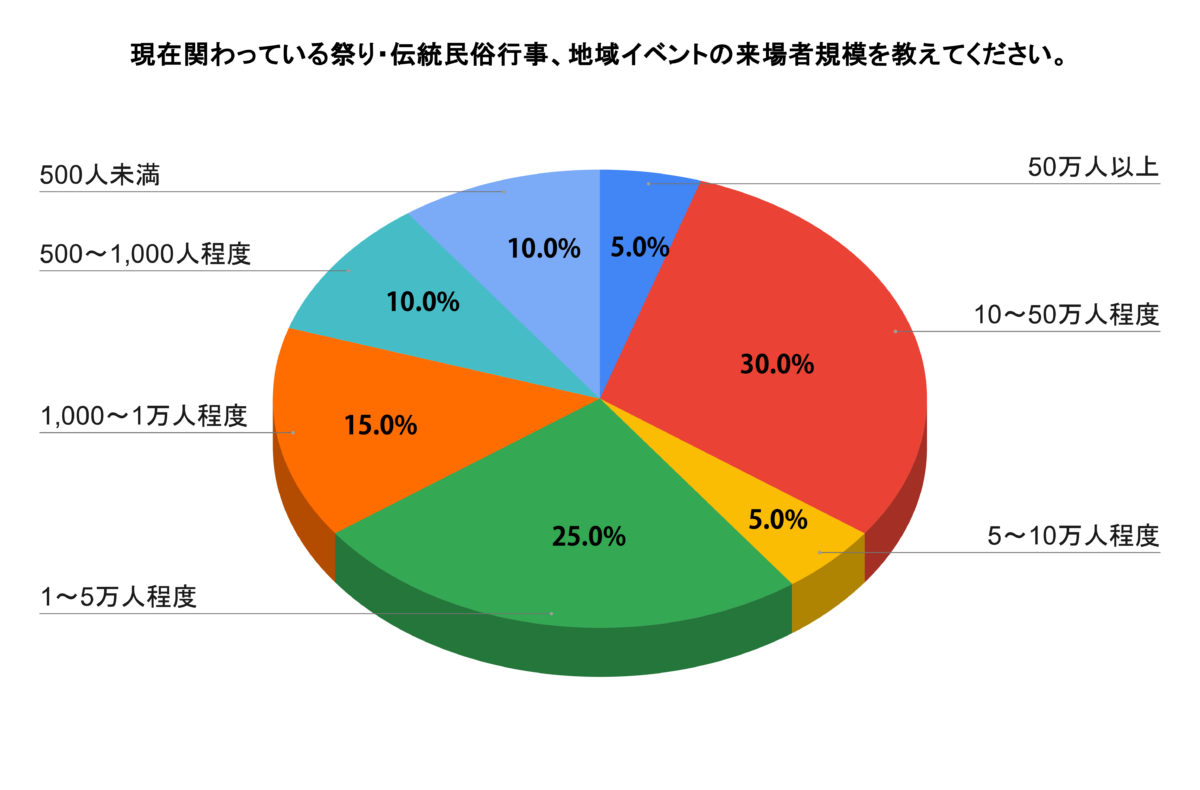 アンケートに回答していただいたのは、自治体職員、観光協会関係者、神社・仏閣の関係者、保存会メンバーなど、多岐にわたる祭り・イベントの運営者の方々です。関わる祭りの来場者規模は500人未満から50万人以上と幅広く、その開催頻度も年1回のものから年に複数回開催されるものまで様々です。