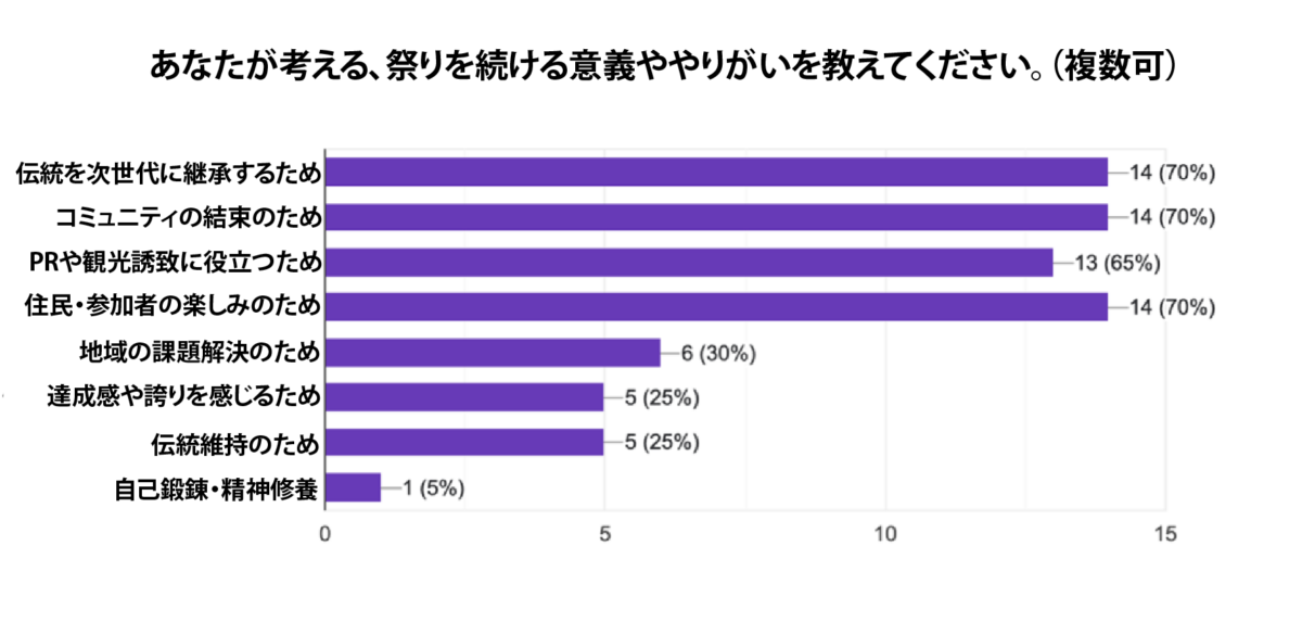 全国の主催者の皆さんは、「伝統文化を次世代に伝えたい」「地域の結束を深める」「観光誘致に貢献する」など、祭りを続ける意義を強く感じている関係者が多いことも、アンケートから明らかになりました。