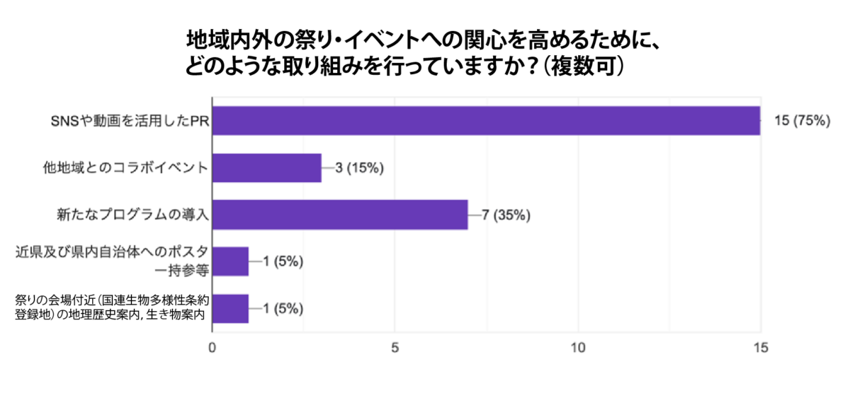 祭り・イベントのPR方法としては、SNSを活用したPRが75%と最も多く、他地域とのコラボイベントや新たなプログラムの導入も検討されています。