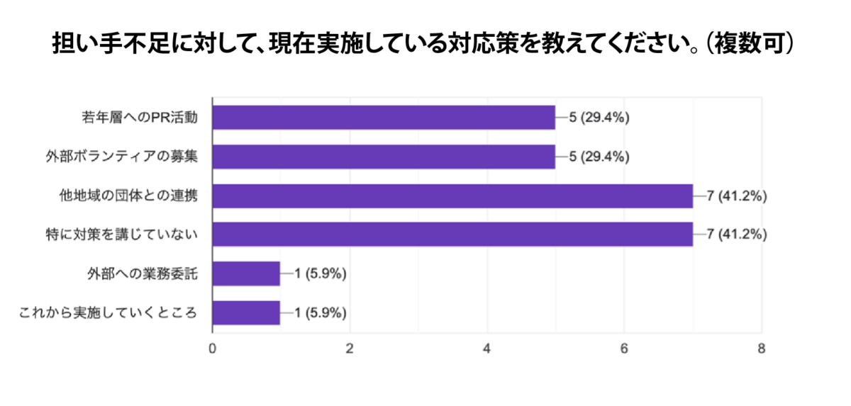 抱えている課題の中で全体の30%を占めたのは「担い手不足」。特に若年層の参加が減少しており、「後継者がいない」「世代間の断絶が深刻」といった声が聞かれました。