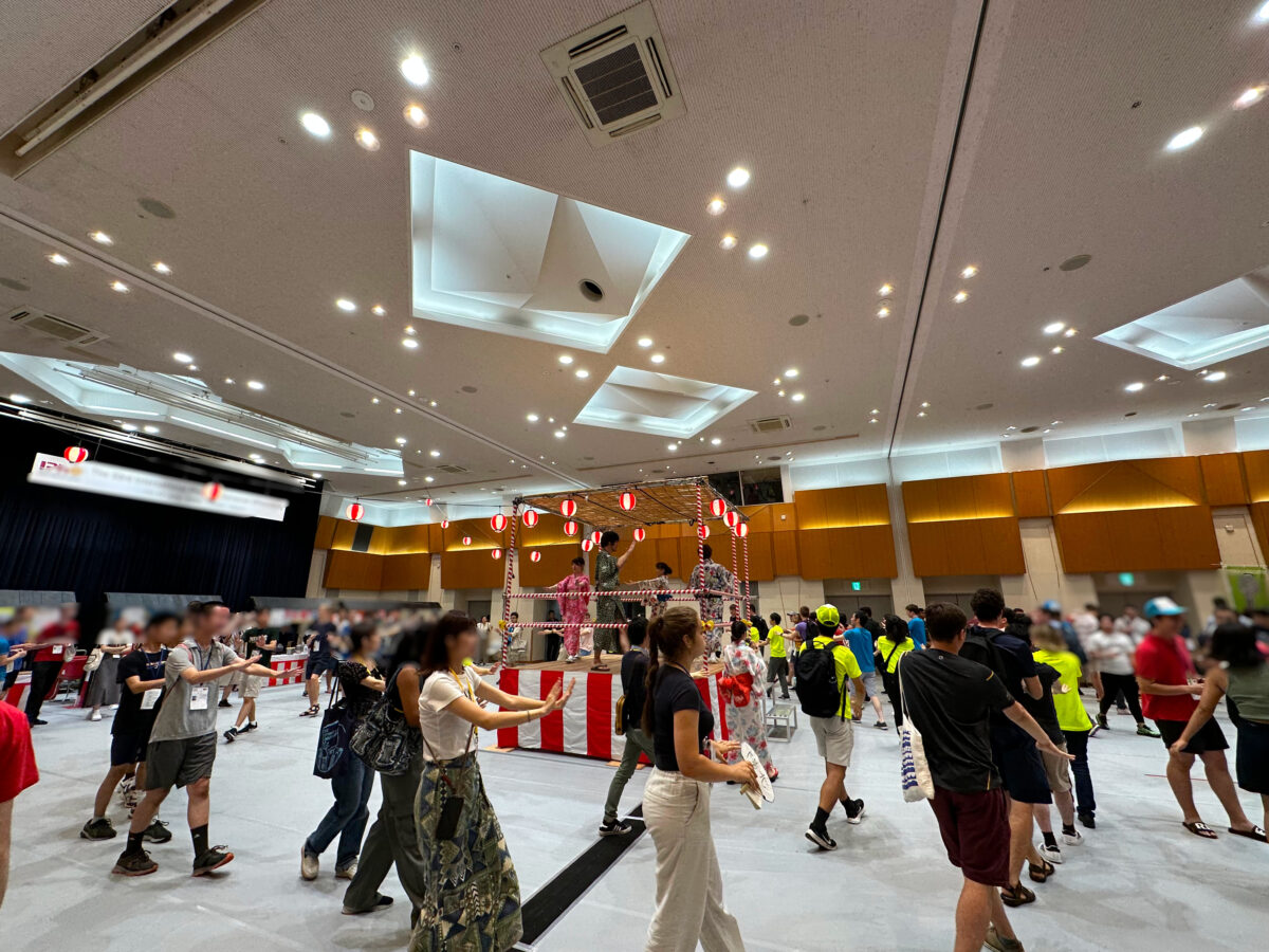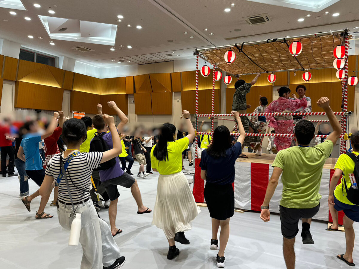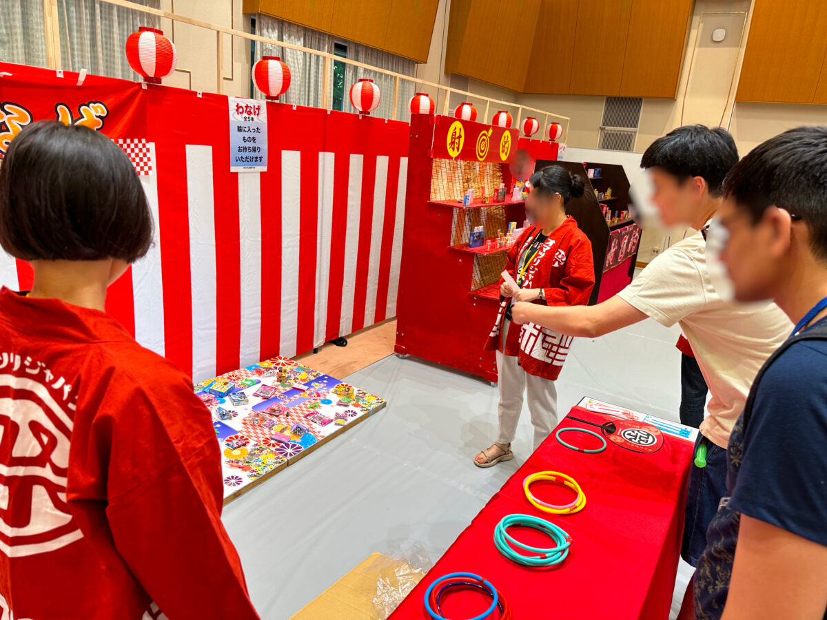 当日は、射的や輪投げ、パンチボックスなどの縁日屋台を設置。会場内にはヤグラを組み、東京音頭や炭坑節といった定番曲に加え、海外でも親しまれている楽曲を交えた盆踊りを実施しました。初めて盆踊りを体験する参加者も多く、踊りの意味や動きを英語で補足説明することで言葉の壁を越えた一体感が生まれました。