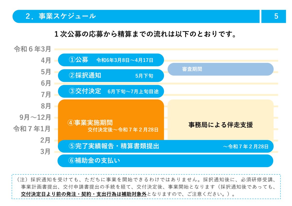 公募期間は4月17日までで、採択は5月下旬を予定し、交付決定は7月上旬までに行われる見込みです。