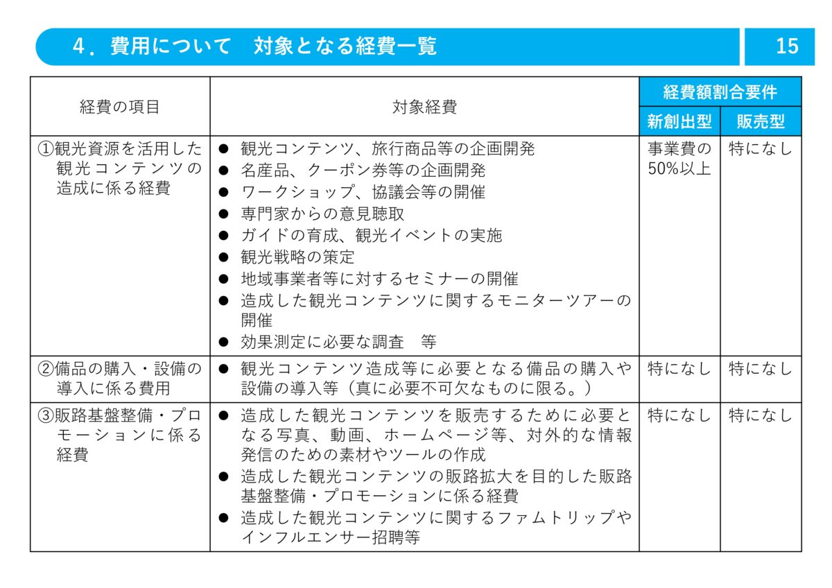 補助事業のポイントとして、費用に関する考え方が重要ですね。「地域観光”新発見”事業」では、事業費が600万円以上の取り組みが対象となります。