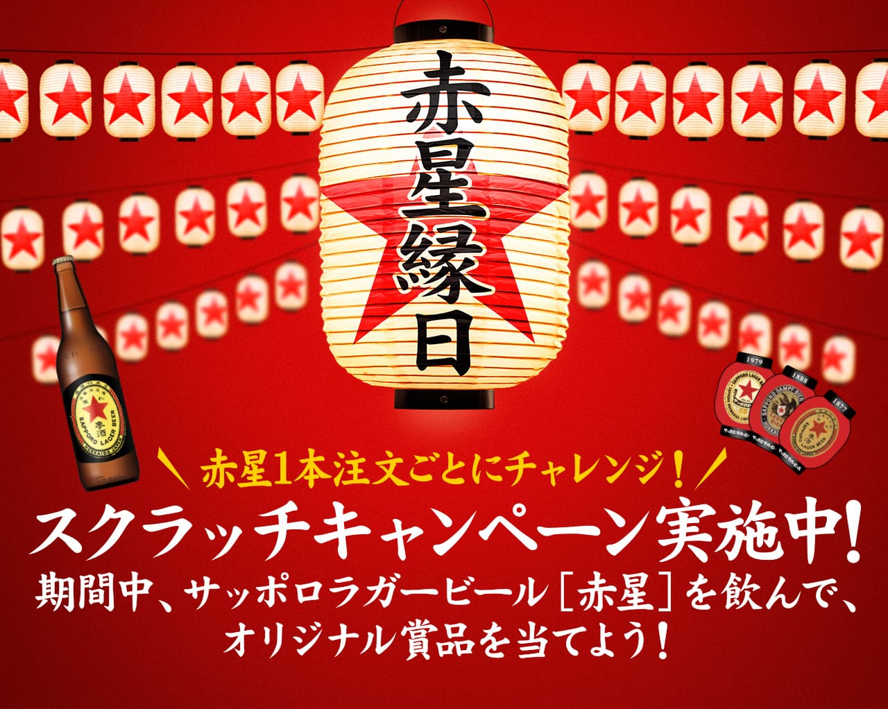 キャンペーン期間中対象店でサッポロラガービール[赤星]を大瓶、中瓶問わず1本注文ごとに1枚スクラッチカードがもらえます。